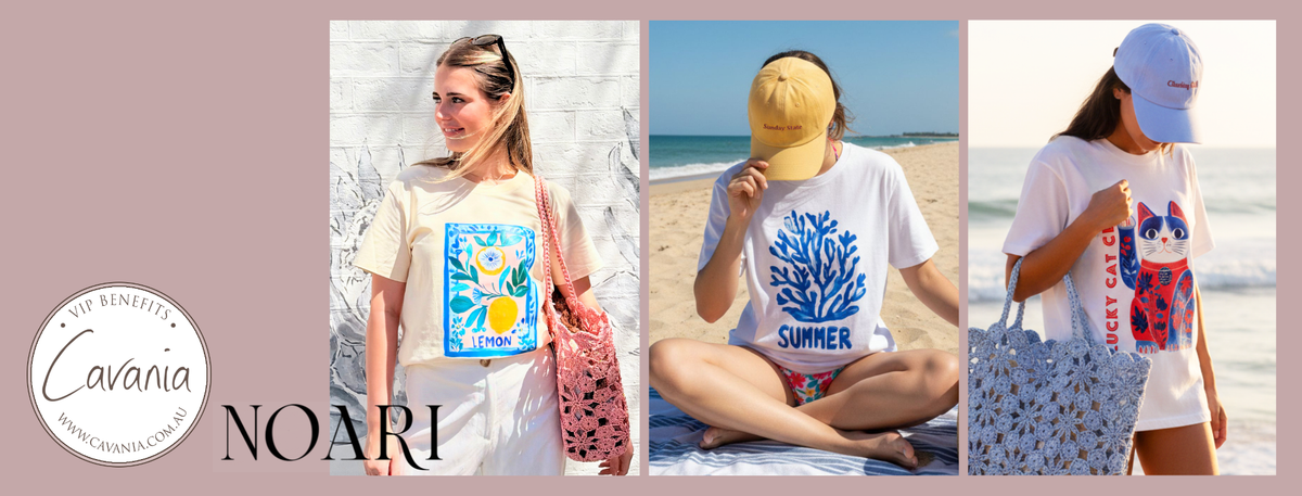 Featuring Noari's "Slow Living Club" Cap and Blue Summer Coral Tshirt. Noari is our favourite labels for premium caps and graphic tees. Their relaxed, effortless styles are perfect for weekend wear, travel and everyday outfits with a little edge.