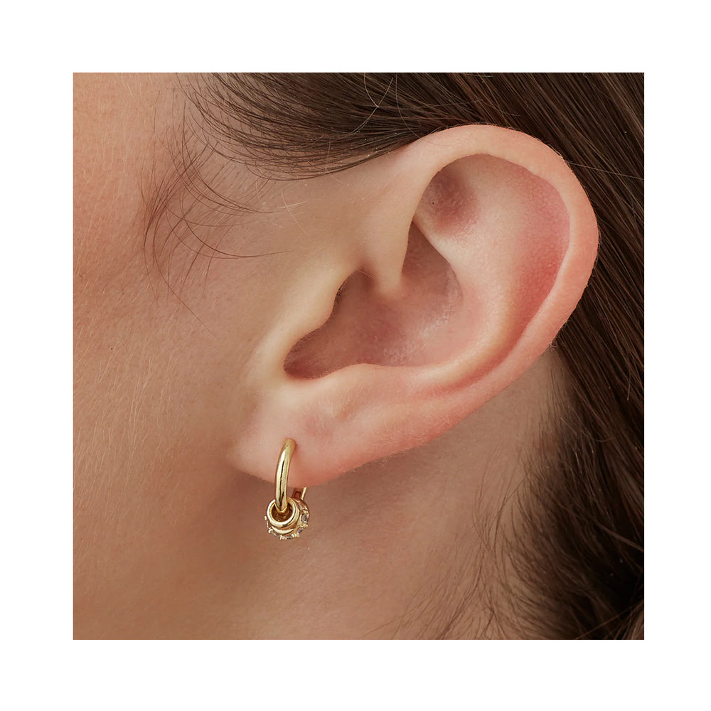 One pair of huggie hoops, multiple styling opportunities! These dainty gold-plated huggie hoop earrings can be worn by themselves or with any of their three disc charms, one of which is studded with sparkly CZ stones.