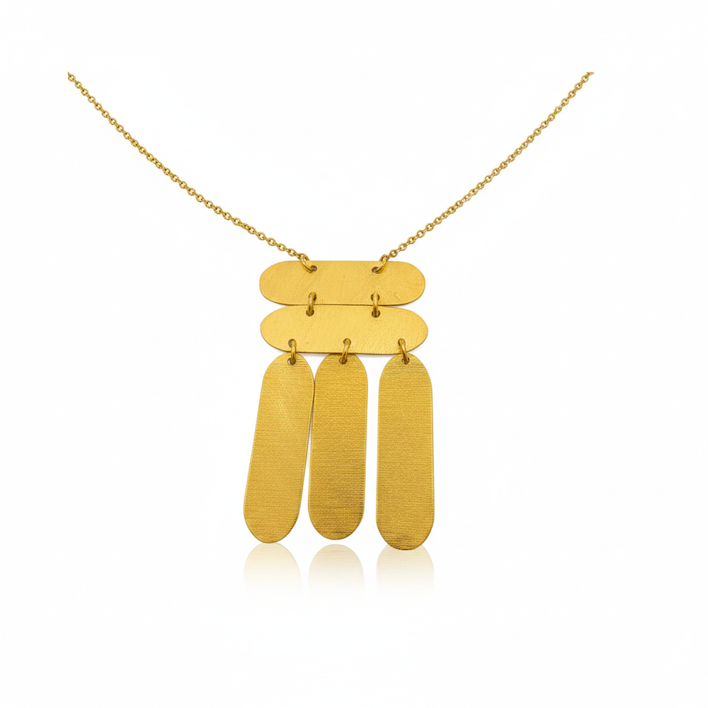 This contemporary statement necklace features a sculptural pendant of five gold-finished oval plates, tiered to create a sophisticated architectural silhouette. Suspended from a delicate matching chain, the minimalist design balances a bold geometric presence with a rich, textured finish that catches the light beautifully.