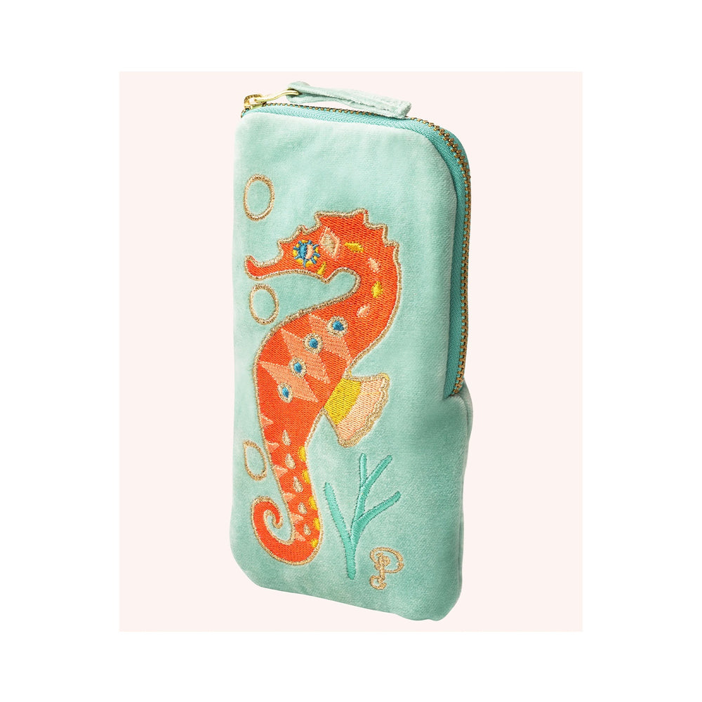 Feminine and bold in equal measure! Our sparkling seahorse dances around this velvet sunglasses pouch, sure to brighten your everyday. Features luxurious hand-embroidery in a gorgeous aqua colourway. Carry down to evening drinks or keep in your hand luggage so your sunglasses always feel luxurious!