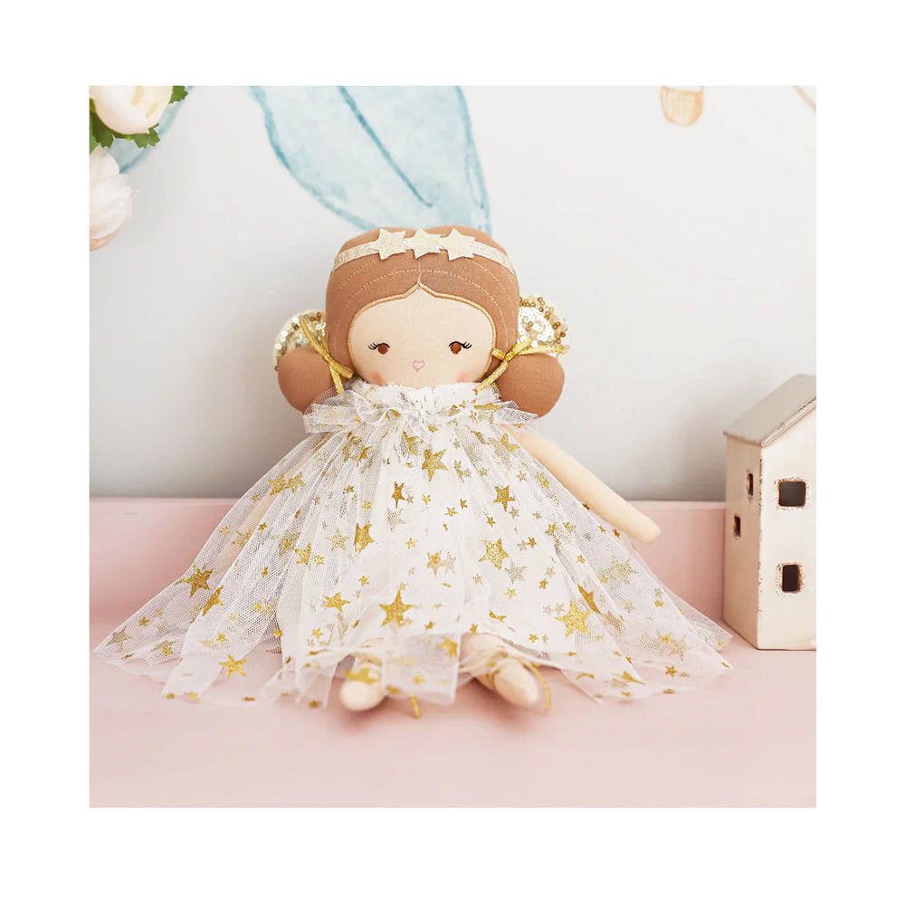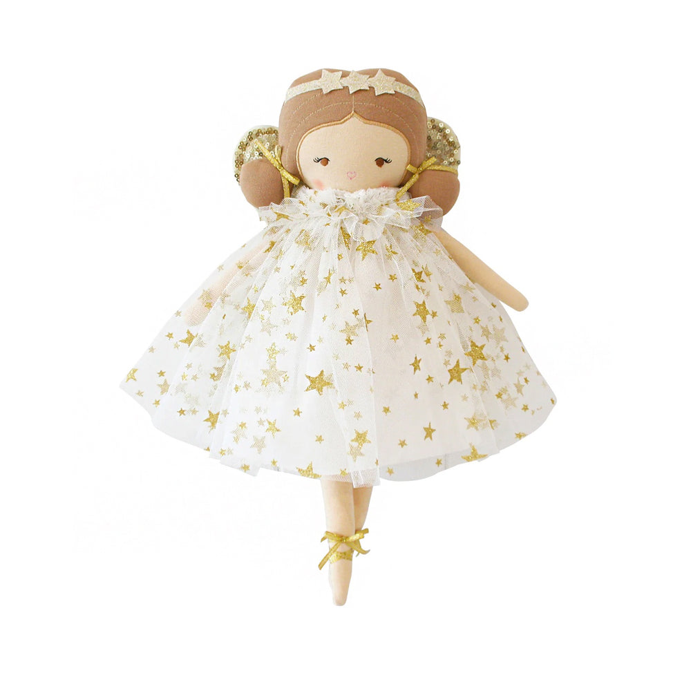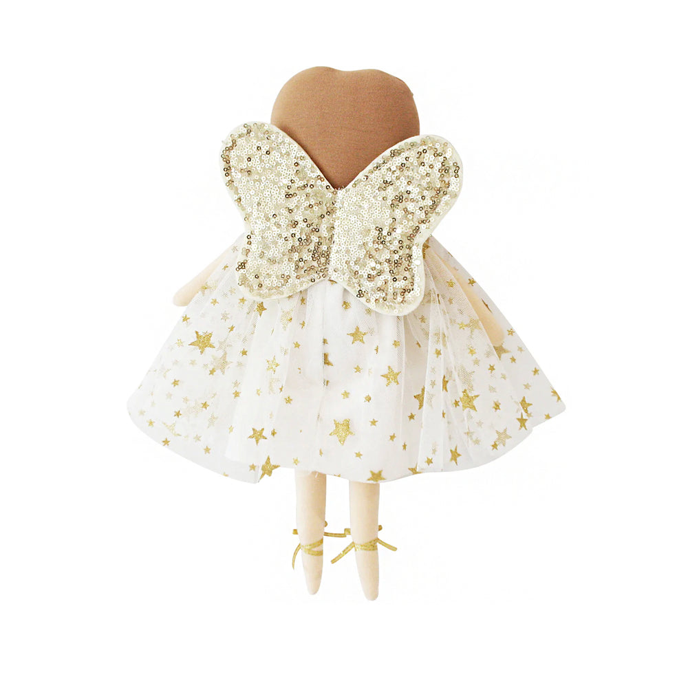 So beautiful! Holly Fairy Doll is a delight in her ivory and gold star tulle dress, gold star headband and gold sequin wings. Suitable from 3yrs.