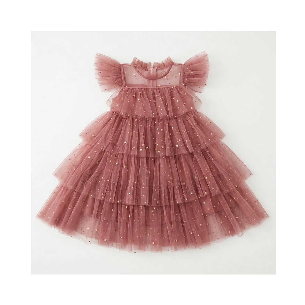 Twirl into her own little galaxy with the dreamy Starlet Dress, leyered tulle with tiny gold stars that shimmer with every step. Soft, floaty ruffles cascade through the skirt and sleeves, giving it that magical "fairy-dust" bounces little gilrs adore.