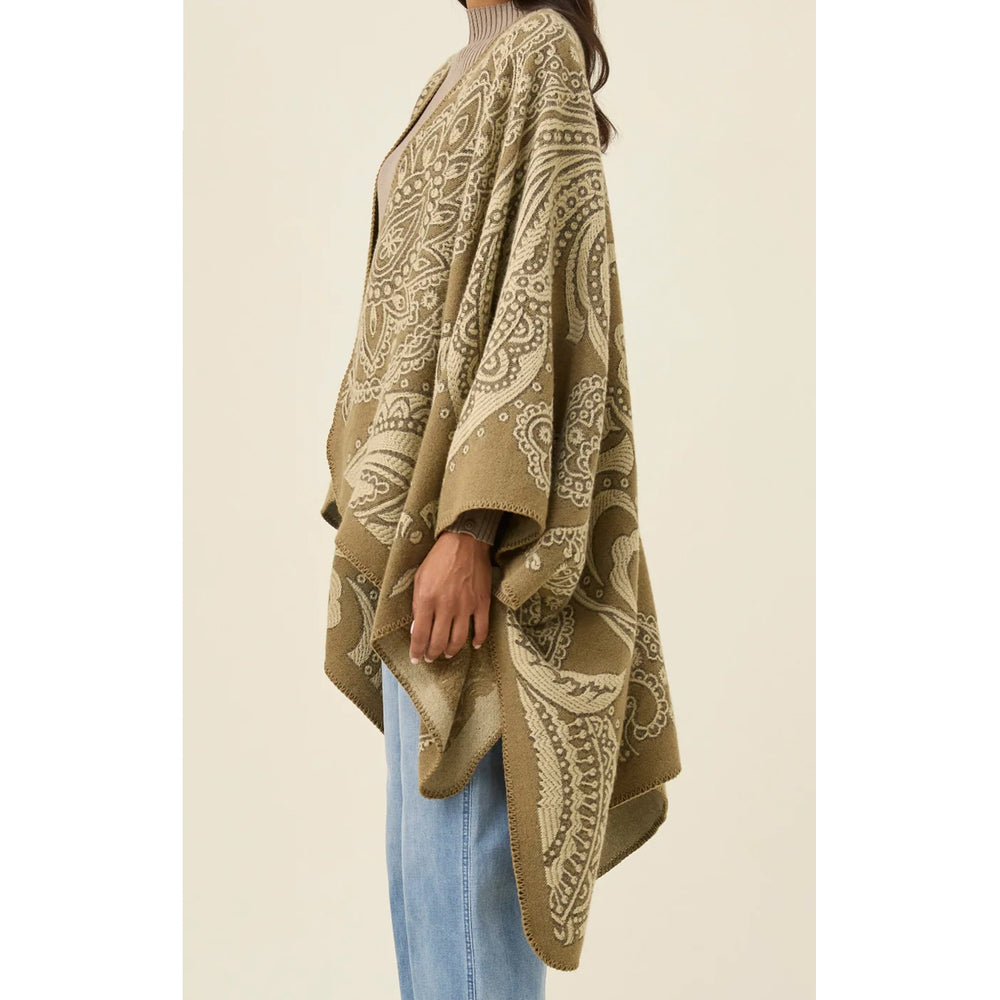 A soft jacquard cape featuring a woven paisley pattern with the option to wear on the reverse side. The oversized shape drapes gently, finished with buttoned sleeves and blanket stitching for a handcrafted touch.
