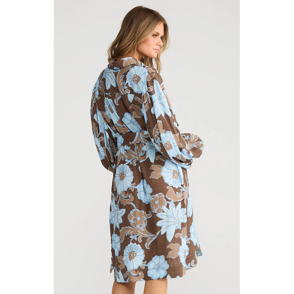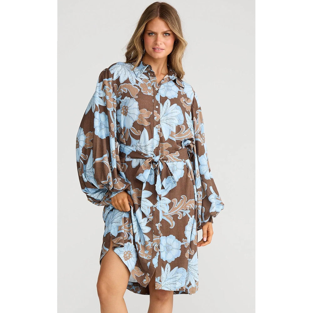 The Annabelle dress combines effortless style with versatile everyday wear. This classic shirt dress features a crisp collar, full button-through front, and relaxed fit that flatters all shapes. The scoop hem and elasticated sleeves add contemporary detail, while the exclusive chocolate Ibiza print from Talisman brings visual interest. Includes a tie belt to cinch the waist or wear loose—dress it up or down depending on your mood. Perfect for casual outings, work, or weekend adventures.