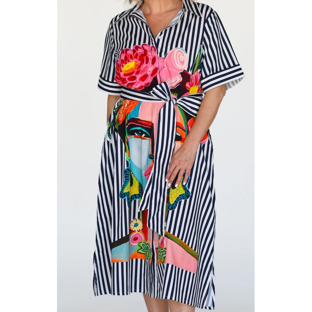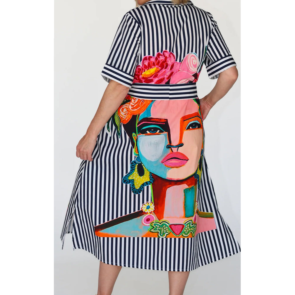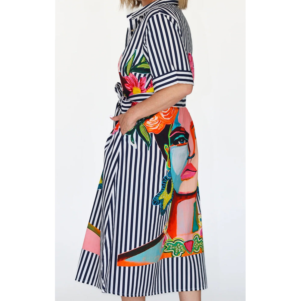 Introducing our fabulous Frida Dress in navy with short sleeves for Summer. Made from 100% cotton, it effortlessly combines playful style with comfort. Featuring a colourful Frida Kahlo print and fabulous navy stripe design, this button-up shirt dress also includes a removable belt for added versatility and pockets! Perfect for any occasion.