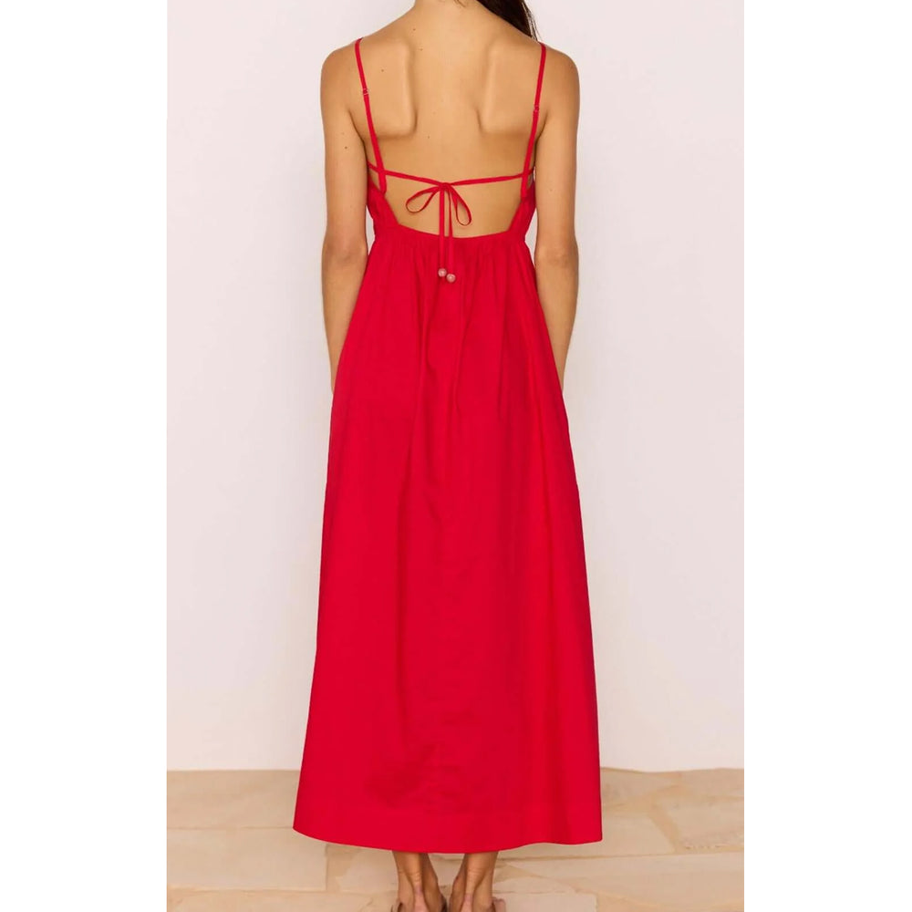 The Margot Red Cotton Linen Blend Tie-Back Maxi Dress is a breezy, statement style designed for effortless summer dressing. Made from a breathable cotton-linen blend, it features a shirred bodice for comfort and a flattering fit, while the flowing maxi skirt creates an elegant silhouette. Finished with an adjustable tie-back, this dress is perfect for relaxed weekends or warm evening occasions.