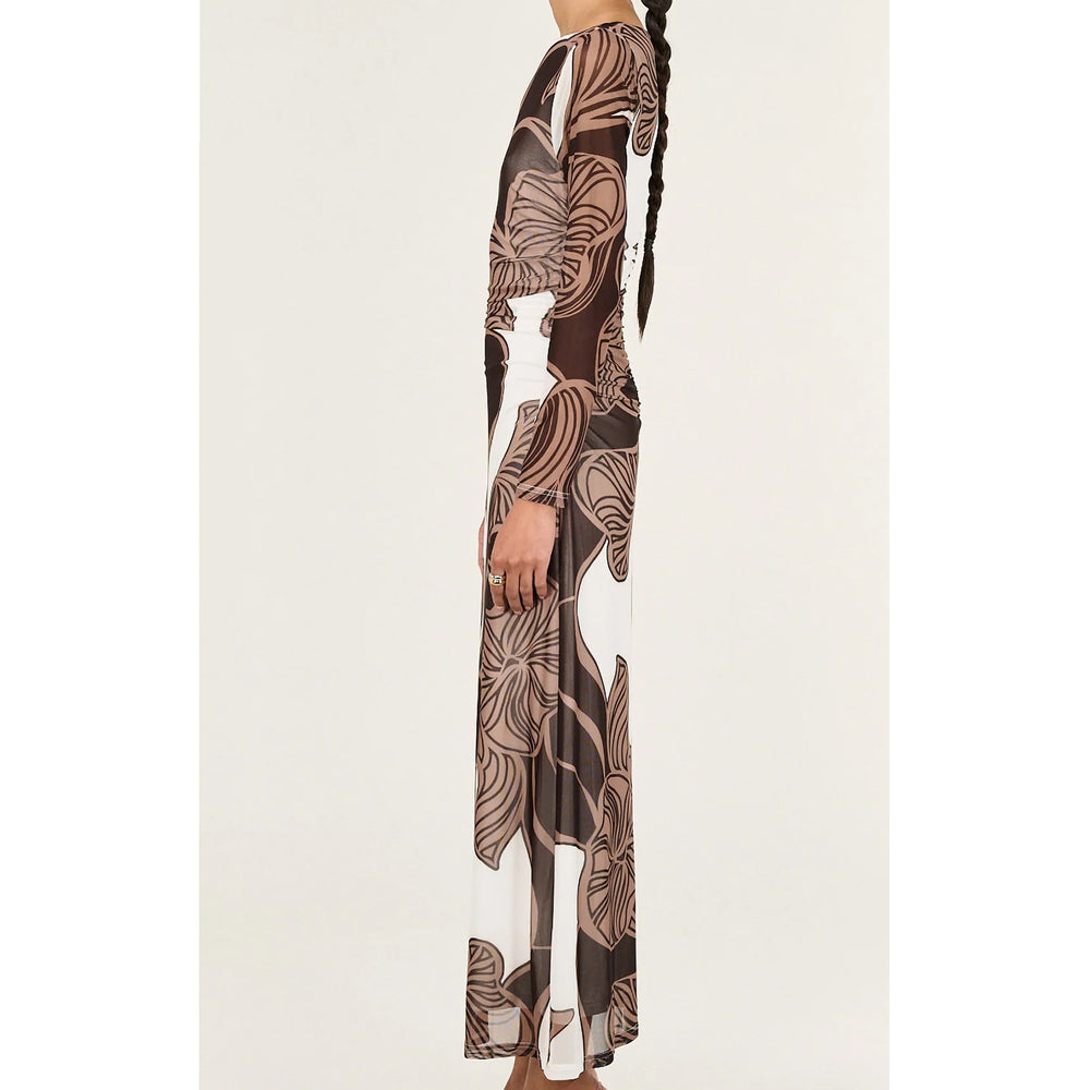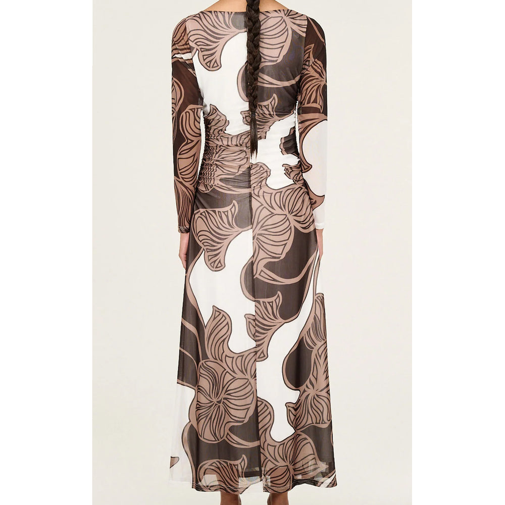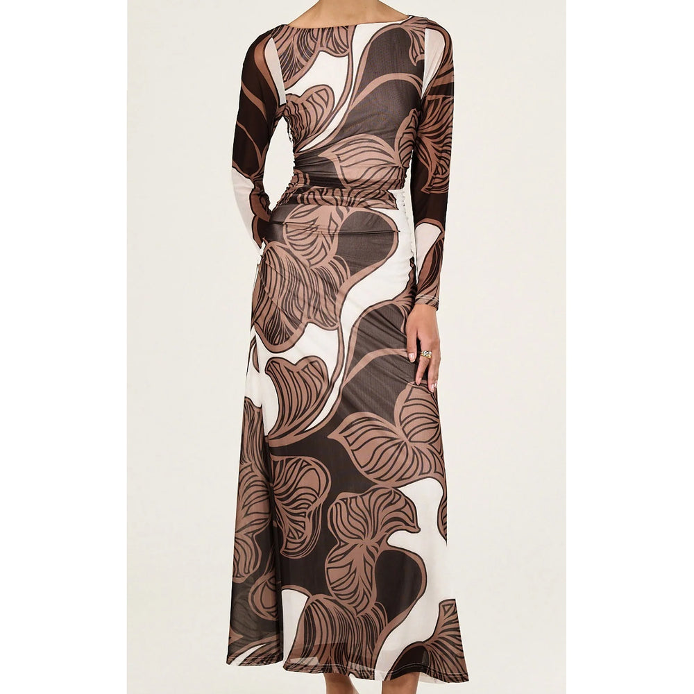 The Abstract Leaf Print Mesh Midi Dress is designed to make a statement with its bold, organic pattern and flattering silhouette. Crafted from a sheer mesh fabrication with a soft stretch, this style features a fitted bodice with long sleeves and subtle ruching through the waist to enhance shape. The abstract leaf print in rich brown and neutral tones adds depth and visual interest, while the midi-length skirt falls with a fluid drape. Perfect for occasion dressing or elevated day-to-night styling.