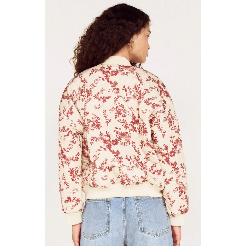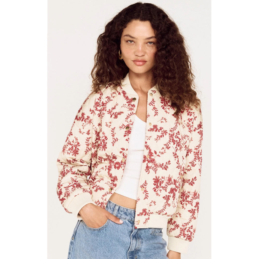The Leona Floral Puffer Jacket brings a fresh, feminine update to your outerwear rotation. Designed with a lightweight padded construction, it features a relaxed silhouette with a snap button front and ribbed trims for a comfortable, easy fit. The soft cream base is adorned with a delicate red floral print, adding a romantic touch to this everyday essential—perfect for layering over denim and casual separates.