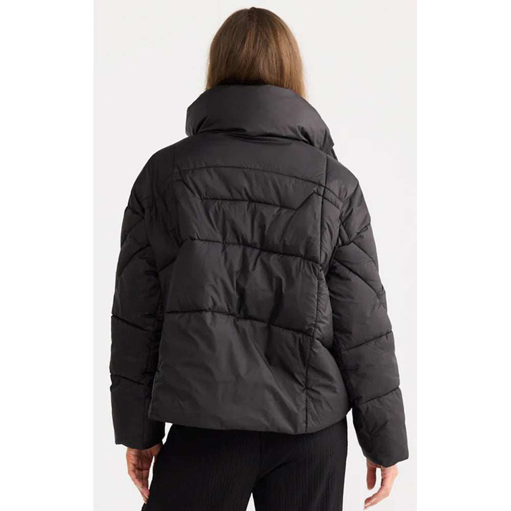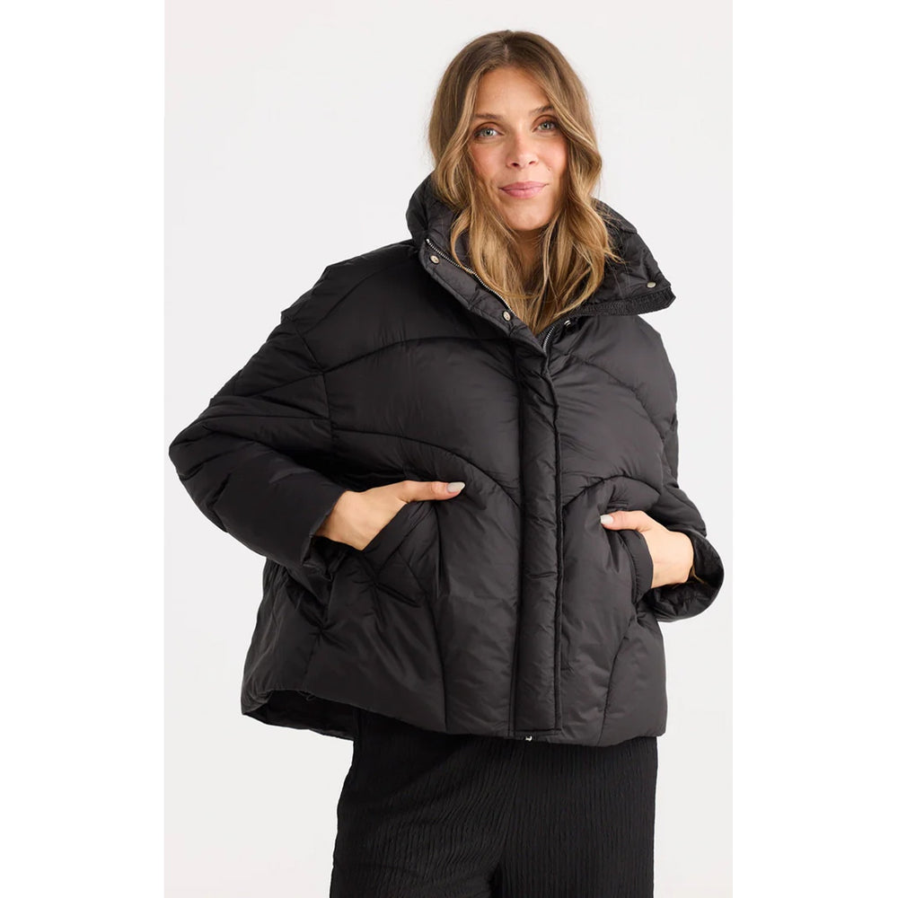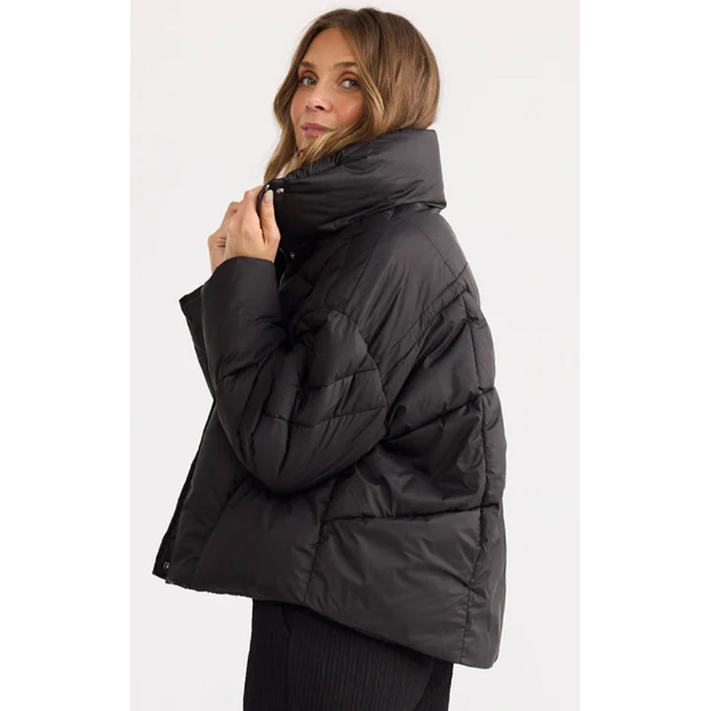The Zella Puffer is a modern outerwear piece with a softly oversized silhouette and a cocooning collar for extra warmth. The sculpted quilting and clean black finish make it an easy throw-on layer for everyday wear.
