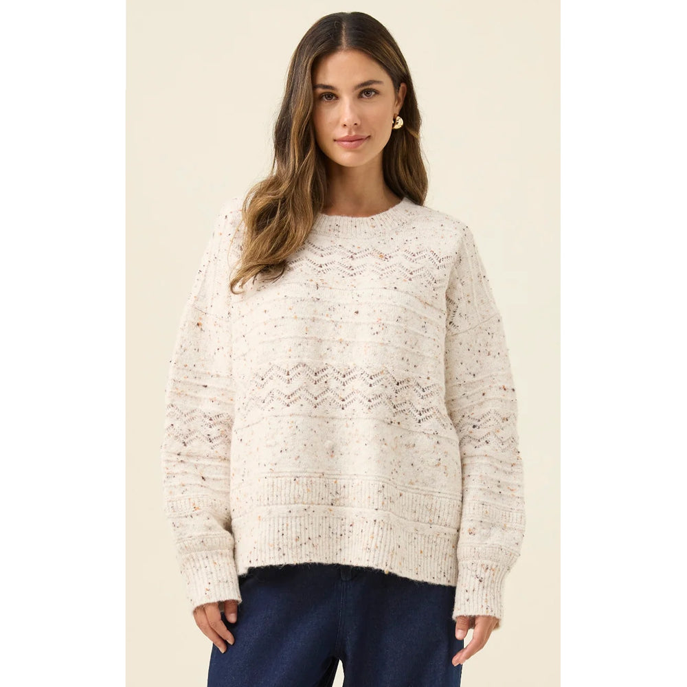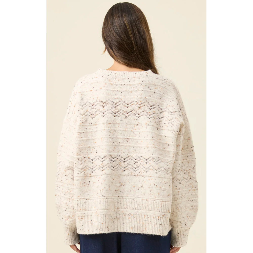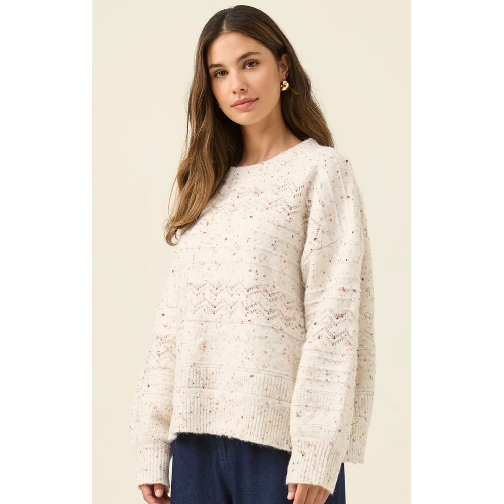 A cosy jumper featuring a multi-pattern pointelle knit that adds depth and texture. The crew neckline keeps the silhouette classic, while the bishop sleeves bring soft volume to balance the lightweight feel.