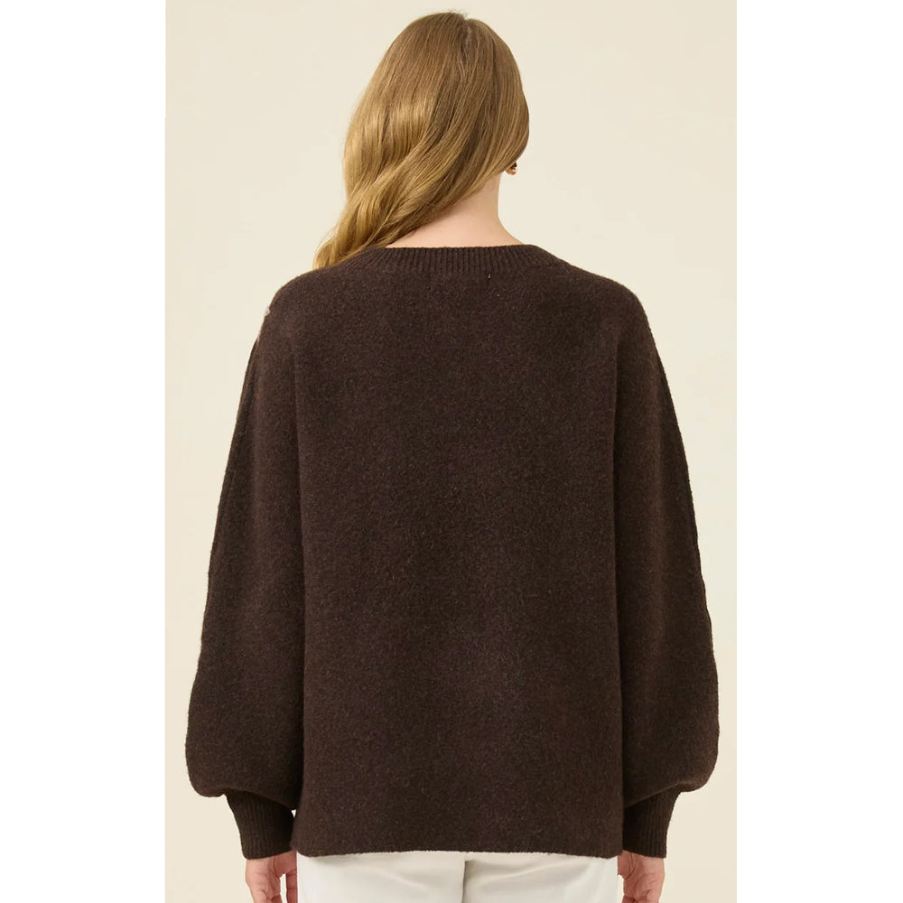 A cosy jumper with a playful stitched flower applique adding gentle charm to the silhouette. The crew neckline and relaxed fit keep it easy to layer, while the bishop sleeves bring soft volume.