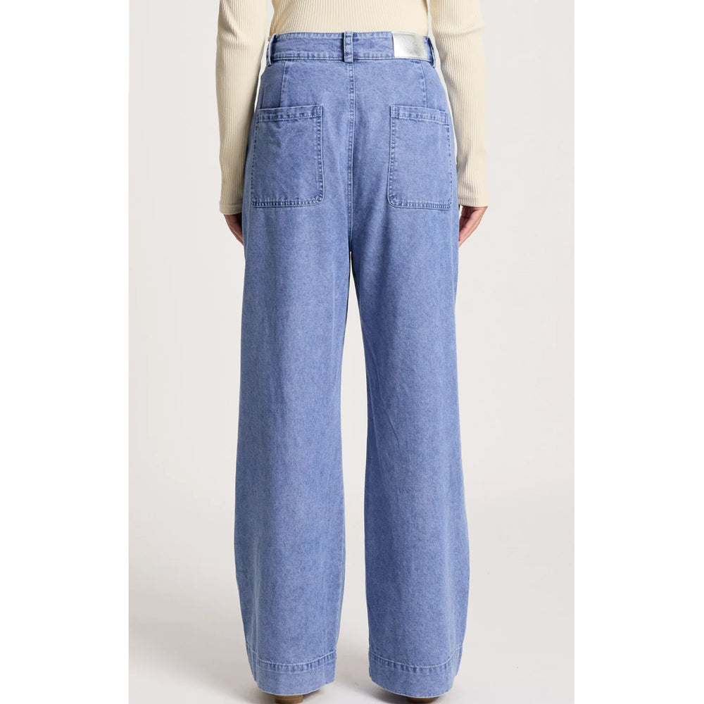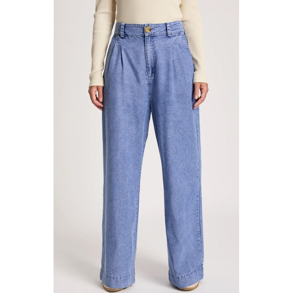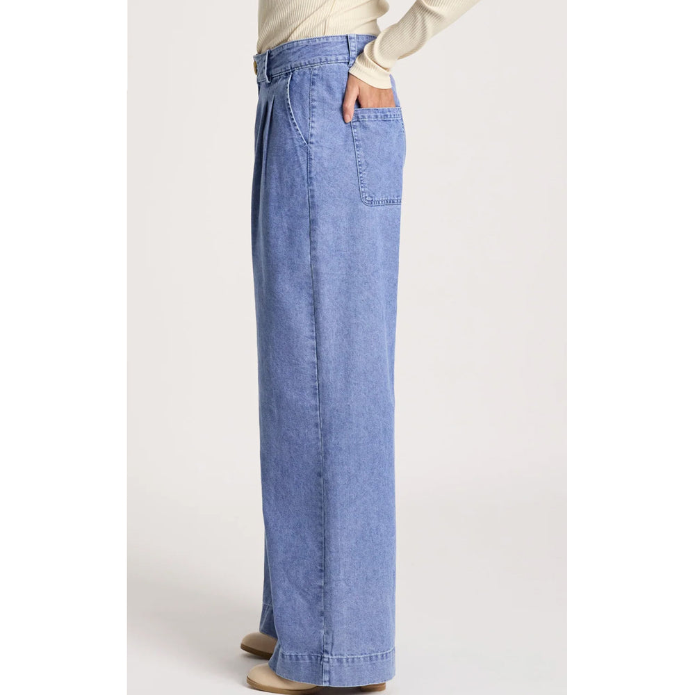 A wide-leg denim pant designed with a flattering mid-to-high rise. Crafted from soft cotton-blend chambray, it features a subtle front pleat for ease and shape, finished with side pockets and a fixed waist closure. A versatile, all-season essential.