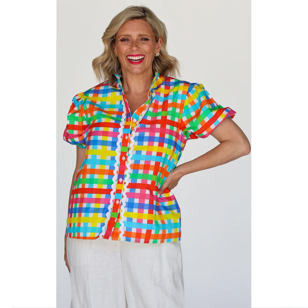 Get ready to turn heads in Chloe! With its bold neon gingham design, this fabulous shirt features a button up front, puff sleeves and ric rac for a touch of whimsy. Made from 100% cotton poplin.