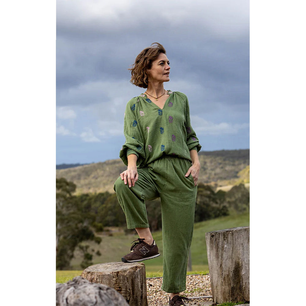 MANDALAY DESIGNS - FOWER PAISLEY EMBROIDERED TOP - Olive
