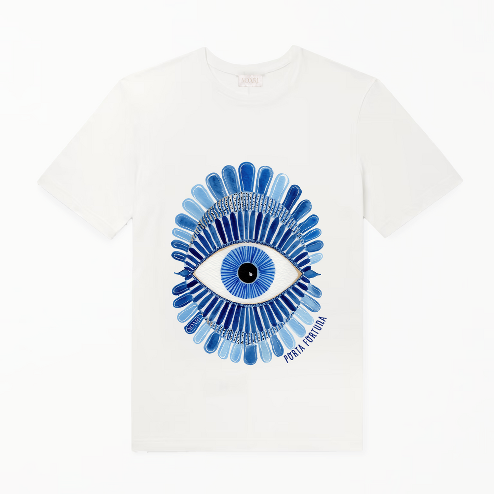 Featuring a mesmerizing eye emblem composed of radiating cobalt and azure brushstrokes, this shirt is a bold addition to any modern wardrobe. The intricate detail and "Porta Fortuna" script bring a touch of ancient Mediterranean symbolism and a sense of guardianship to your daily attire.