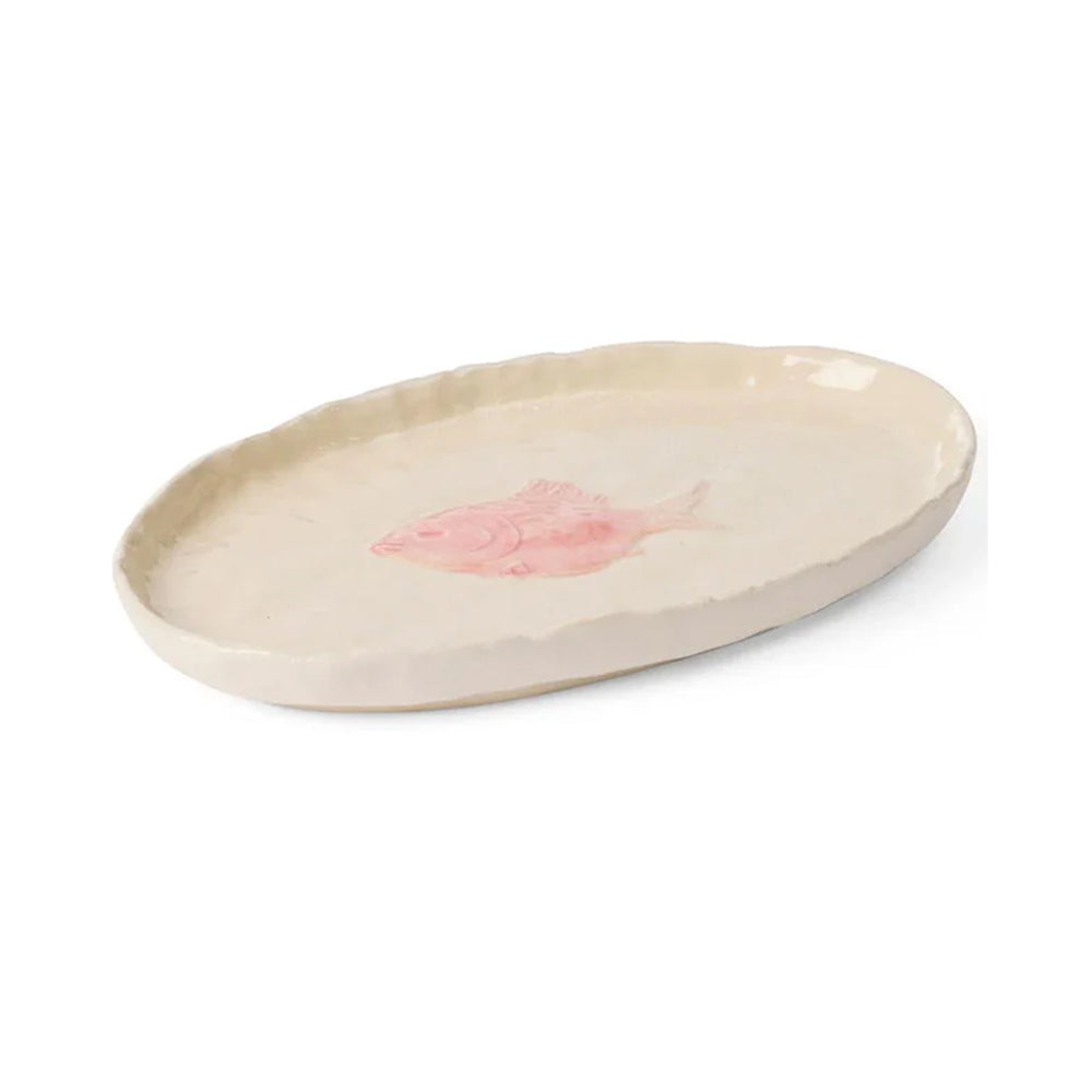 Natural organic-shaped plate with hand-painted pink dimensional minnow and a glazed finish.