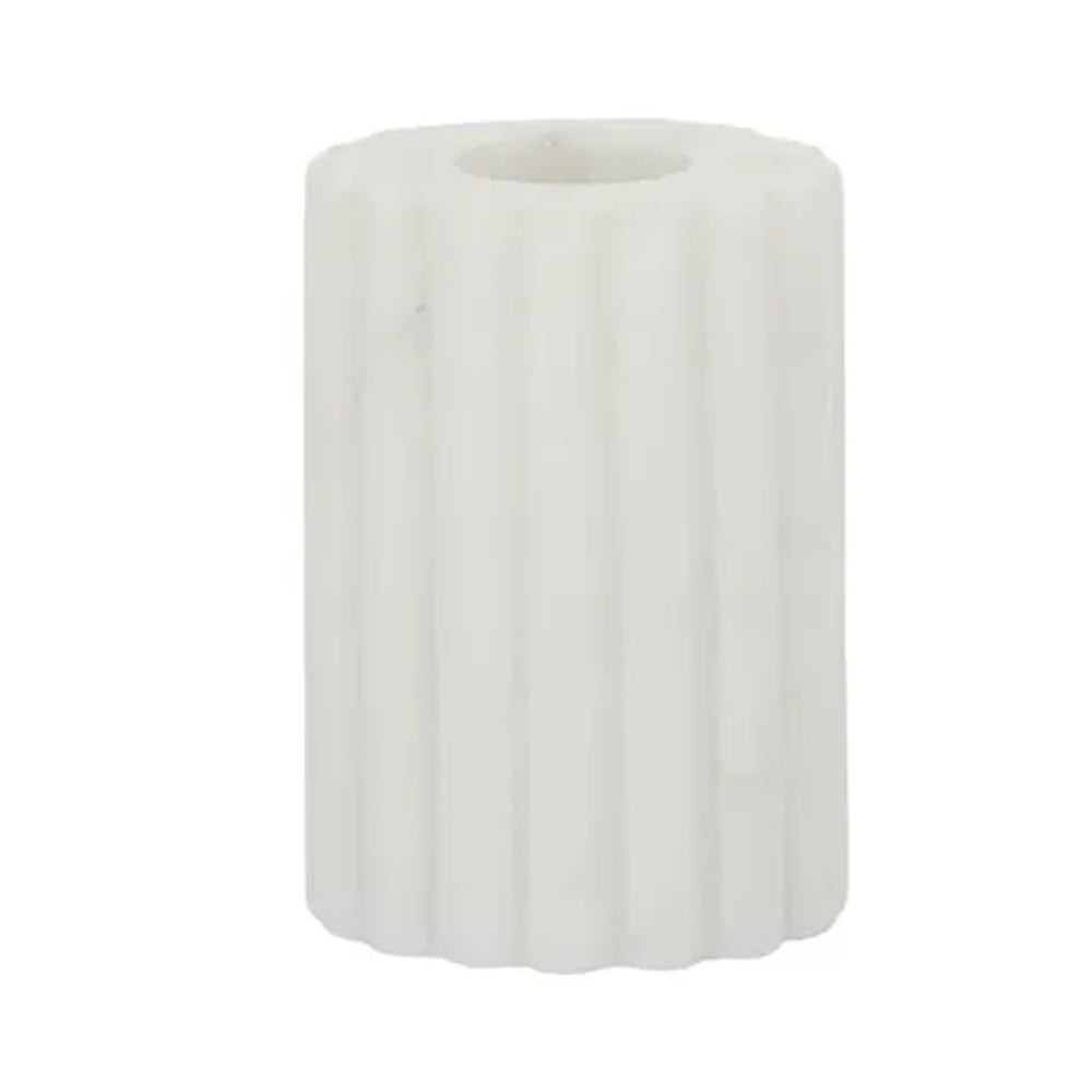 This Mara Marble Candleholder has a beautiful white colour with a ribbed design. It makes a great centrepiece or on a book shelf. Pop your favourite long candle in to add a dash of colour to it.