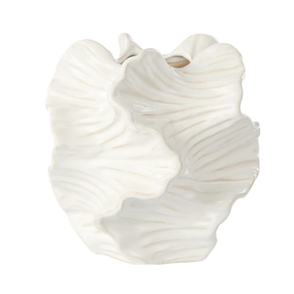 This Opus Ceramic Vase Small is crafted from stoneware in a white finish and abstract wavy seashell silhouette.