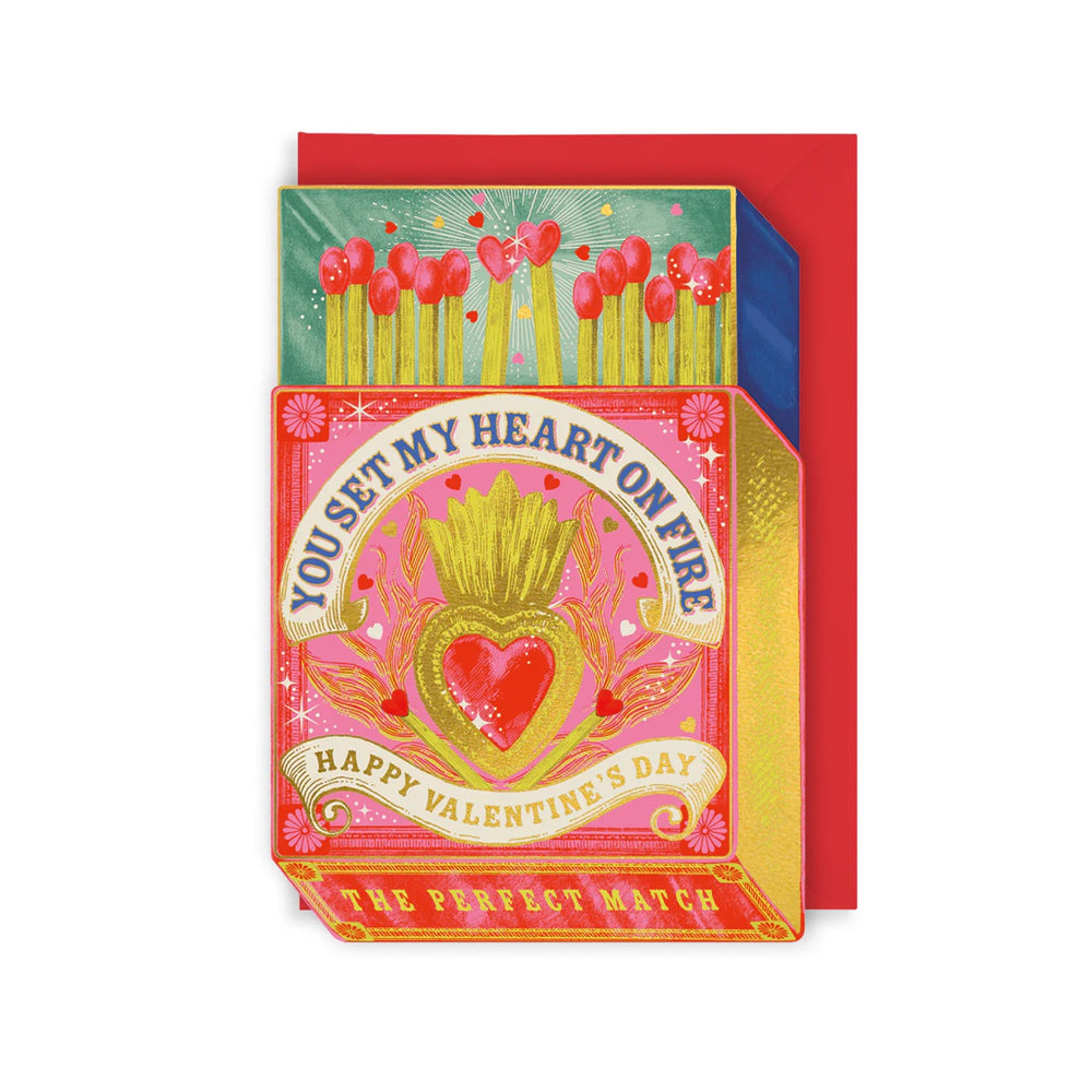 Say happy Valentine's Day with this stunning greetings card. This card features an antique match box with the caption "You set my heart of fire, happy Valentine's Day. The perfect match".