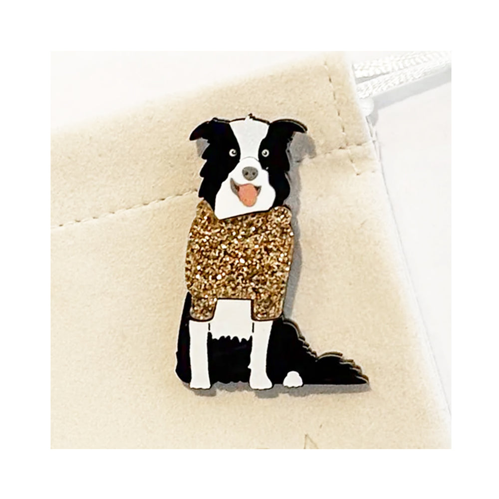 Dressed his best in a sparkly gold sweater, Buddy has put his best paw forward and will certainly add a bit of extra pizazz to your style. High energy and high fashion go hand in hand in this Border Collie brooch.