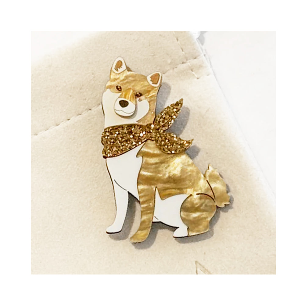 Doug the Shiba-Inu is showing his inner diva and becoming your favourtie detail! Don't let his laid-back pose fool you, Doug is ready to strike a pose and be the paw-fect addition to any outfit! Well groomed with a sandy pearl sheen going through the design, accessorised with a sparkly neck scarf, the Doug brooch will certainly be an eye-catching feature and amazing talking point.