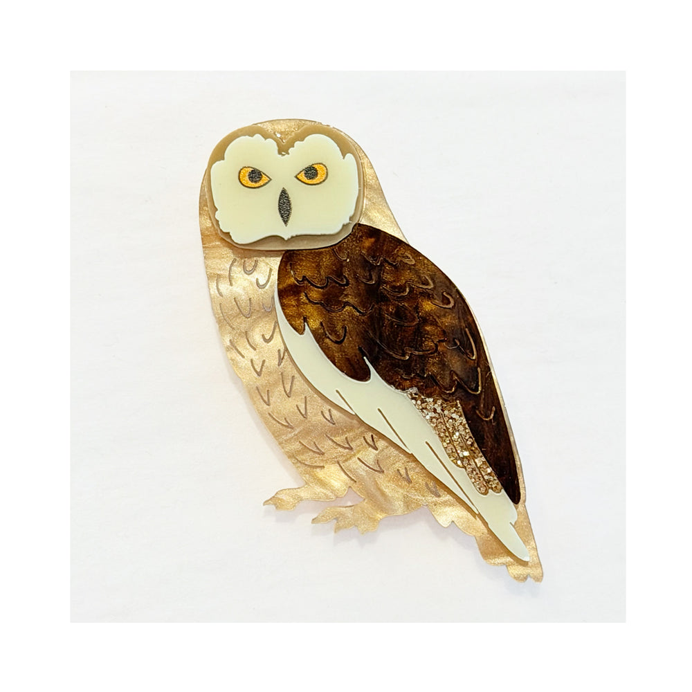 Featuring pearlescent buff, white and rich chocolate layers, with a pop of gold in the wing, this Owl brooch will be a unique feature of any outfit, creating a standout moment.