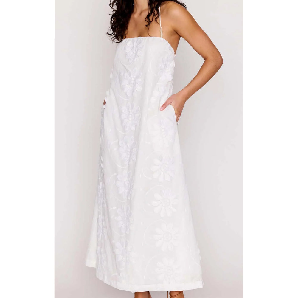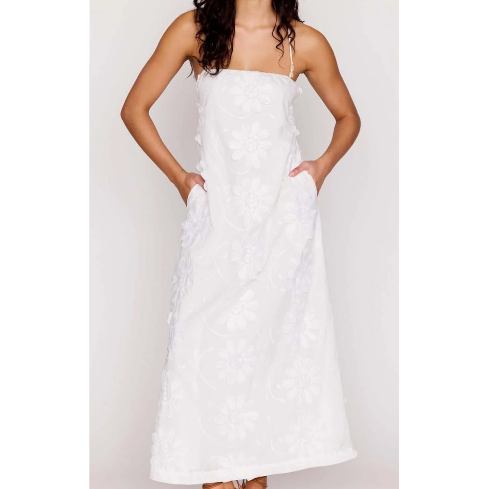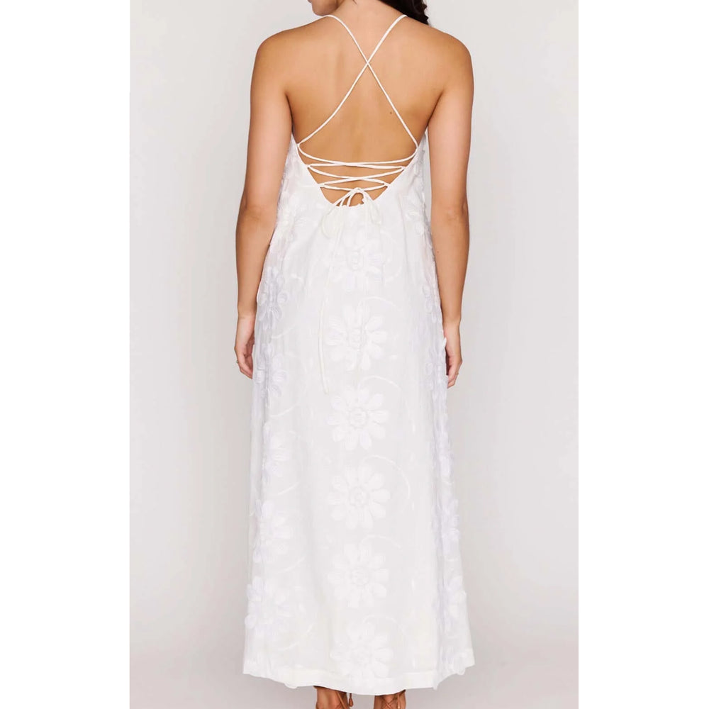 Effortlessly elegant with a romantic twist. This White Cotton Floral Applique Lace-Back Maxi Dress features delicate straps, a softly structured silhouette and a statement lace-up back that turns heads from every angle. Finished with intricate floral applique and crafted in breathable cotton, it’s perfect for summer events, long lunches and warm nights out.