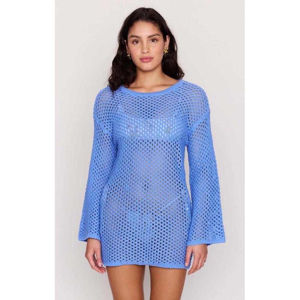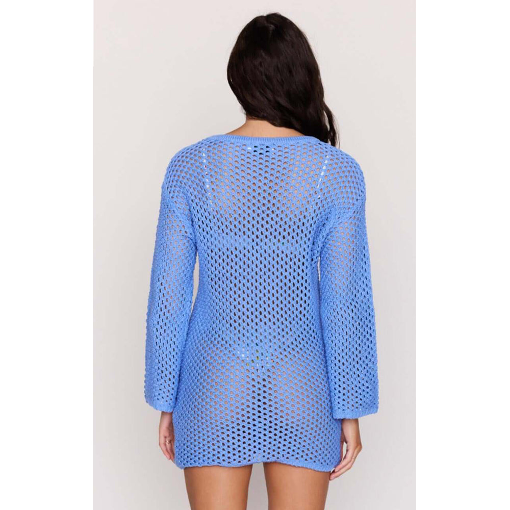 Easy, breezy, and made for warm days, the Balmy Blue Cotton Crochet Knit Mini Dress is the ultimate throw-on-and-go style. Featuring an open-knit crochet design with long sleeves and a relaxed mini silhouette, this cotton dress is perfect layered over swim or styled for sunset drinks. Lightweight, breathable, and effortlessly cool.