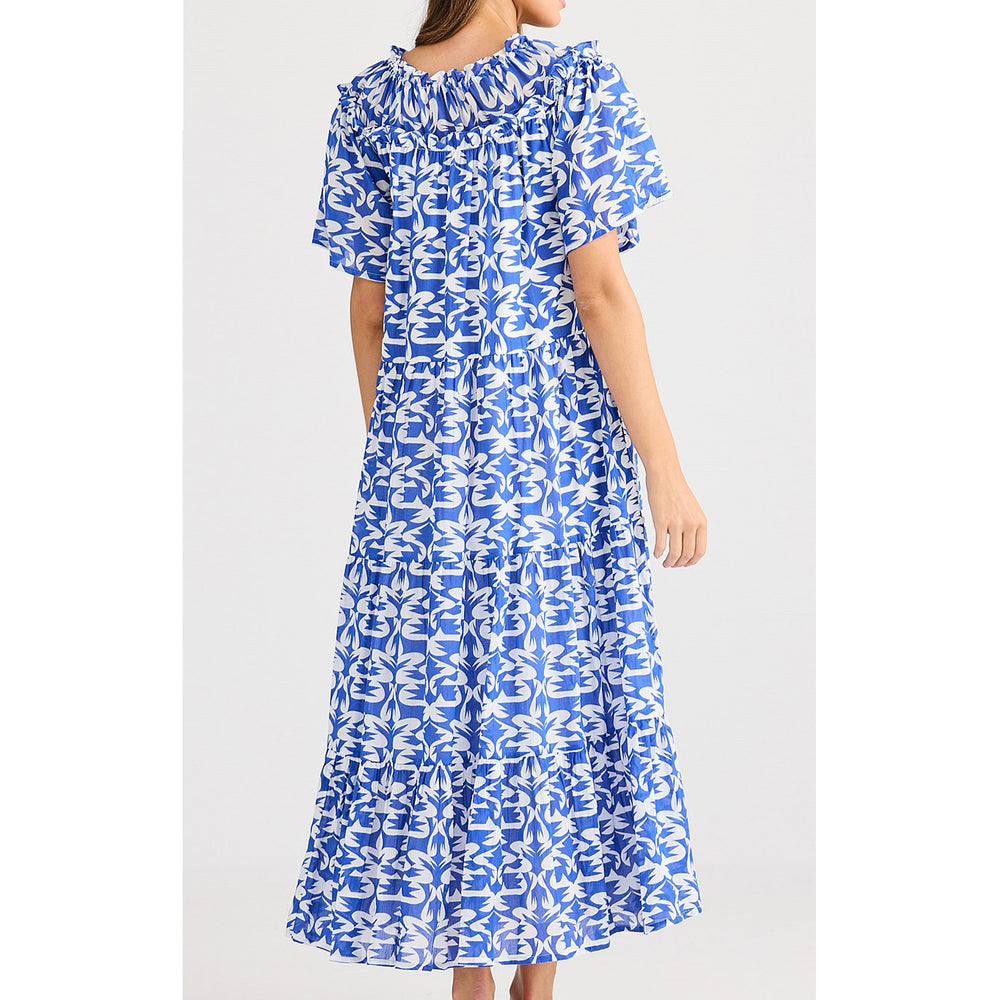 The Soliel Midi Dress in tile print features a ruffled neckline with a tie closure and short ruffle sleeves. It has a three-tiered gathered skirt and offers a relaxed fit in a midi length silhouette.