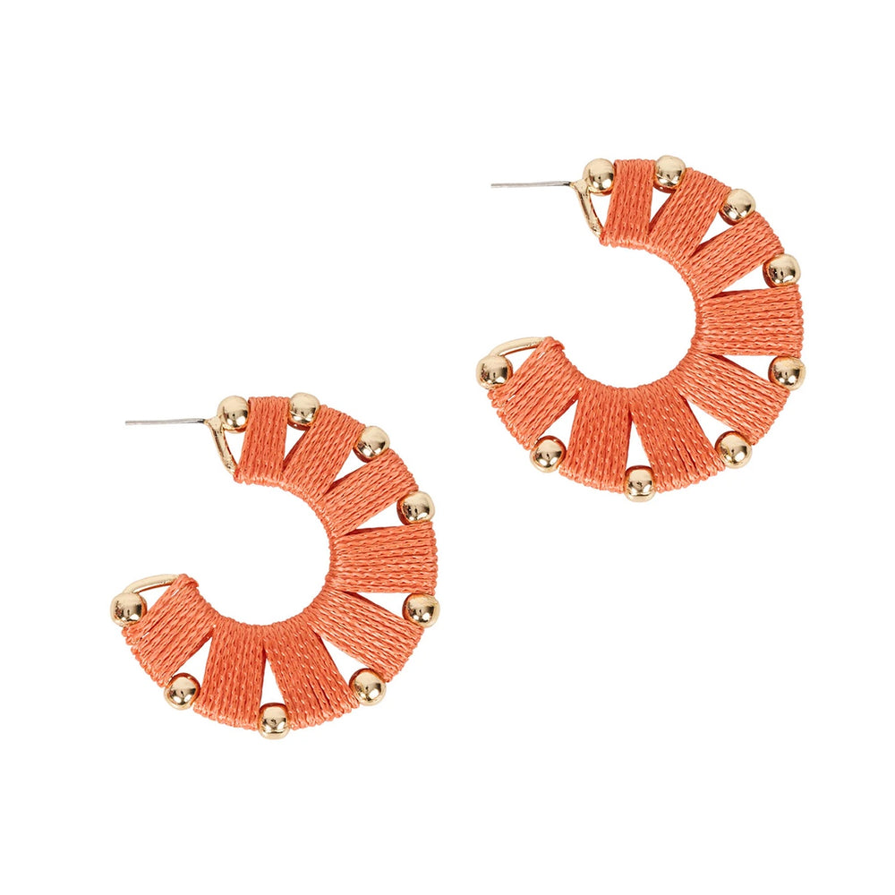 Summer-ready hoops crafted in woven thread with gold bead detailing. Lightweight with playful texture.