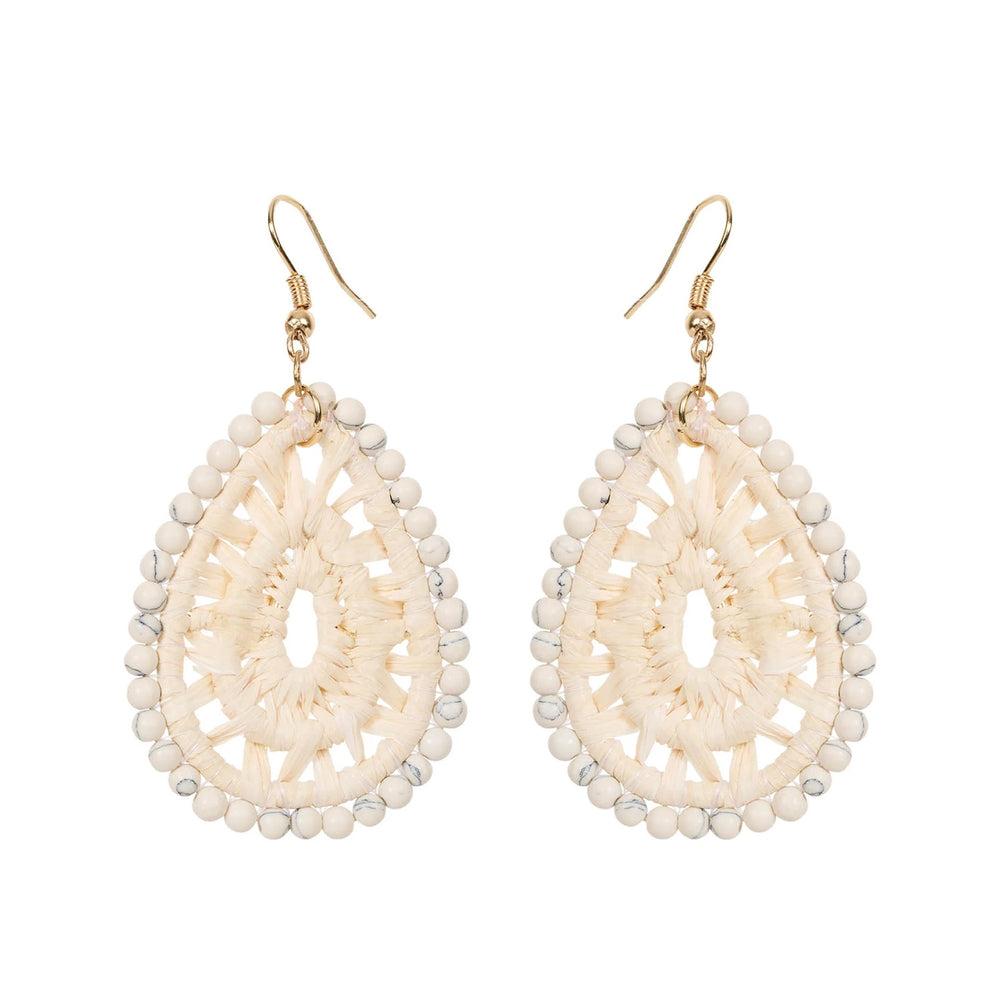 Statement teardrop earrings wrapped in natural raffia with stone detailing. Lightweight for all-day wear.