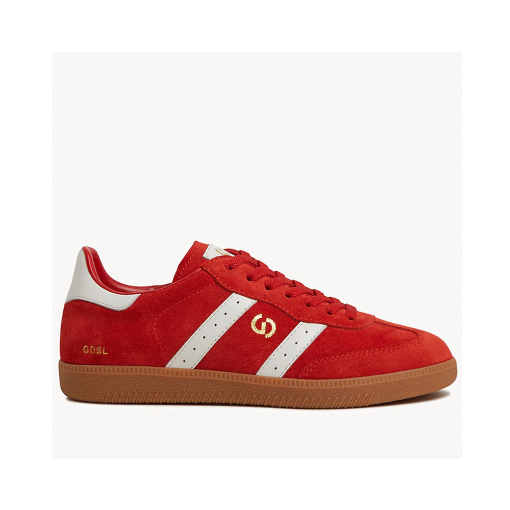 - Aurora Red suede and white waxy leather with a parallel overlay design