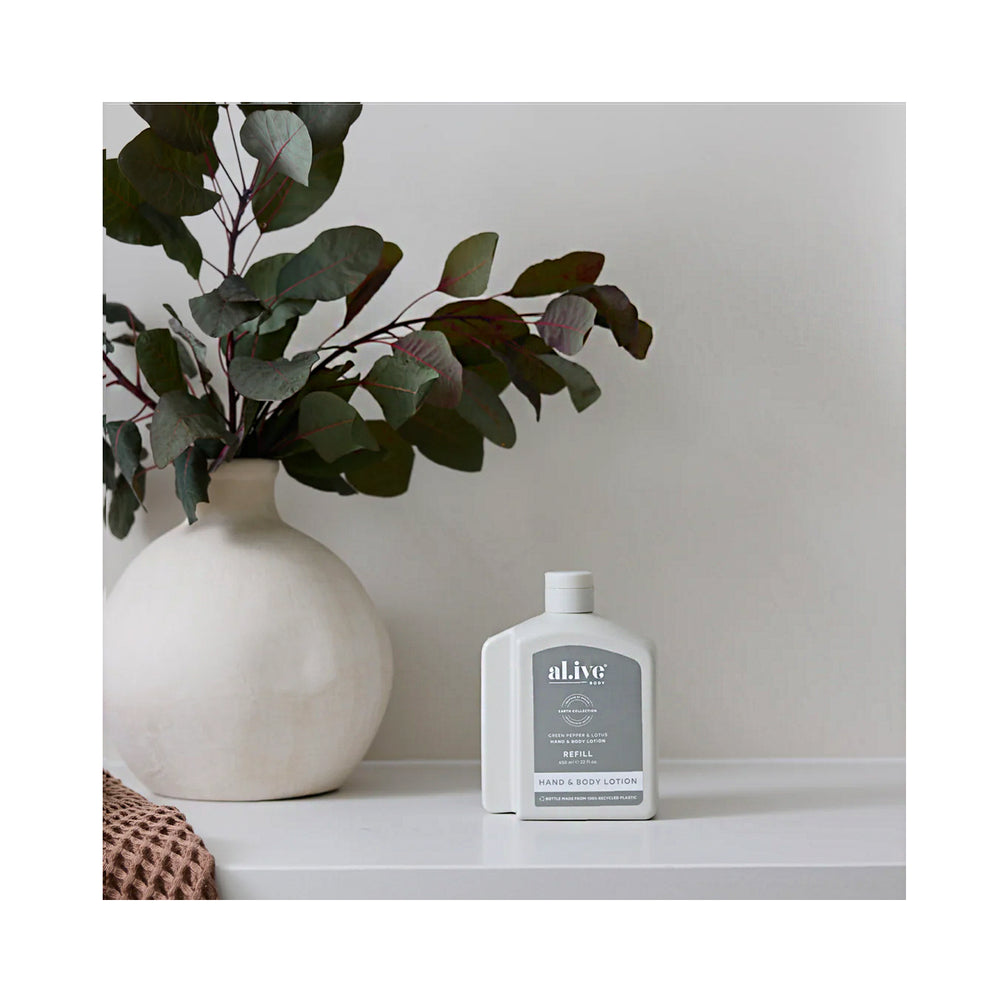 Refill your Green Pepper & Lotus Lotion bottle with our 650 ml Lotion Refill. This sustainable refill solution is designed to reduce waste and offer a practical, eco-friendly way to top up your favourite al.ive body essential.