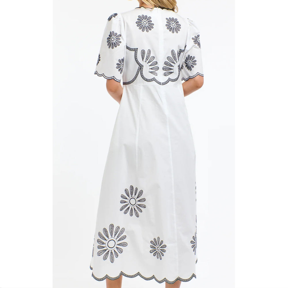 Effortlessly elegant, this white cotton dress features delicate embroidered daisies across the front and along the hem for a feminine touch. The contrast navy scalloped neckline and short sleeves add a refined pop of colour, giving this classic silhouette a modern twist. Finished with a concealed back zip for a seamless fit, this 100% cotton dress is perfect for warm days and special occasions alike.