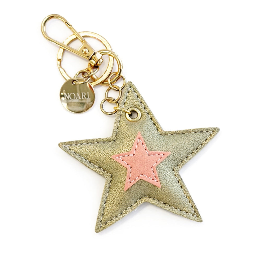 This silver star key chain adds a pop of sparkle and shine with its gold and baby pink design. Its high quality visible stitching around the edged features as an extra detail, making this an eye-catching accessory for all.