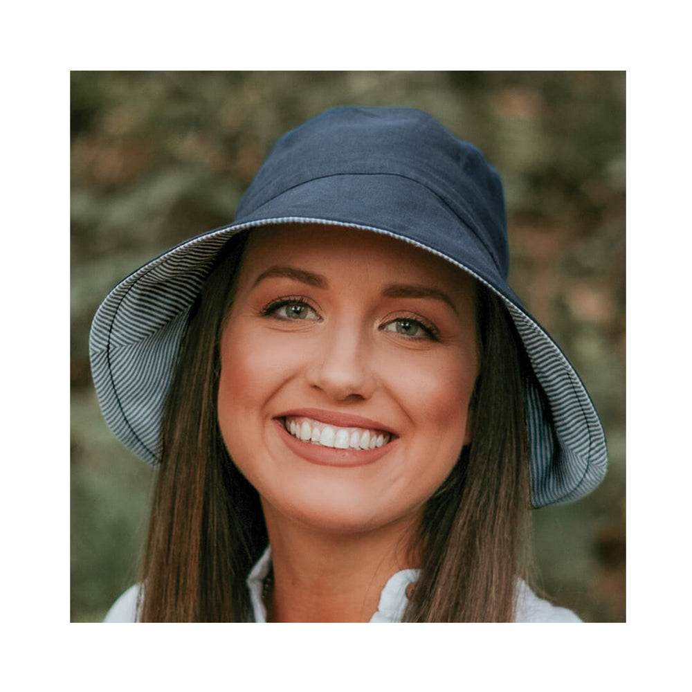 Perfect for all the family! Our Charlie print features inky blue and white stripes with a reverse of Indigo. Available in Sun Bonnet, Flap Hat, Classic Bucket, Ladies Wide Brimmed Visor, Adults Frayed Bucket Hat and Ladies Sun Hat.