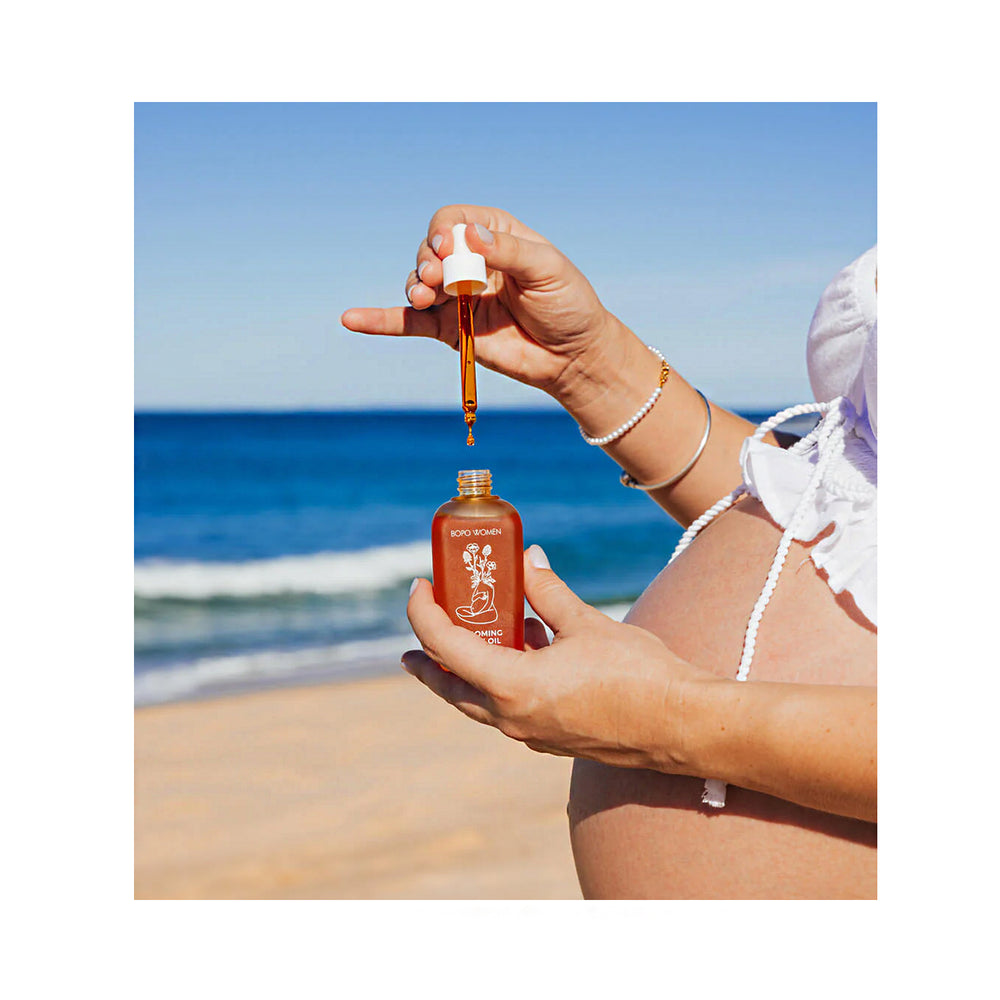 The Blooming Belly Oil is a nurturing ritual for your evolving body, designed to support elasticity and replenish stretching skin. This luxurious blend features healing rosehip, raspberry seed, kakadu plum and seabuckthorn oils, rich in antioxidants, essential fatty acids and vitamins that care for stretch marks and soothe tight skin. A silky base of sweet almond and avocado oils delivers lasting hydration, while its delicate scent creates a calming moment just for you (and baby).