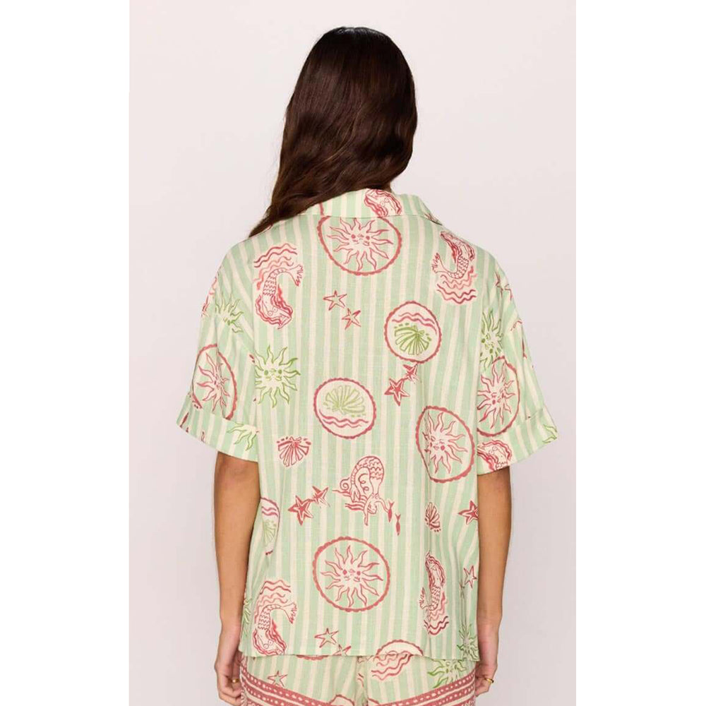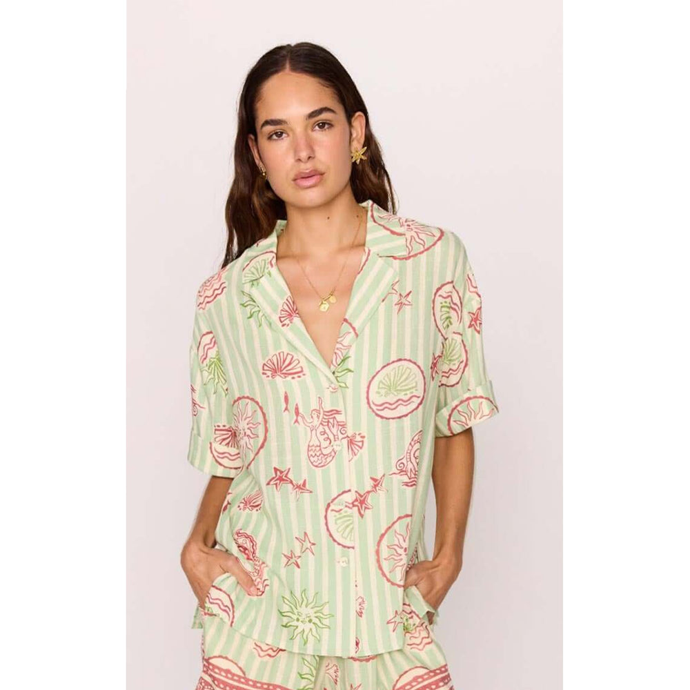 Bring a touch of coastal nostalgia to your summer wardrobe with the Soleil Linen Blend Green Stripe Printed Shirt. Designed in MINKPINK’s exclusive sea-inspired print, this relaxed button-up is perfect for beach days or paired with the matching shorts for an effortless resort look.