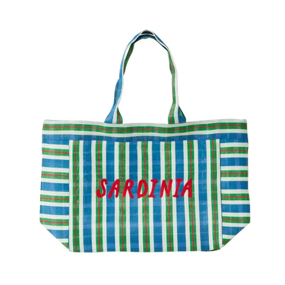 Carry all your summer essentials in this cute tote bag. Features stripes in blue, green and white with the word Sardinia in red.