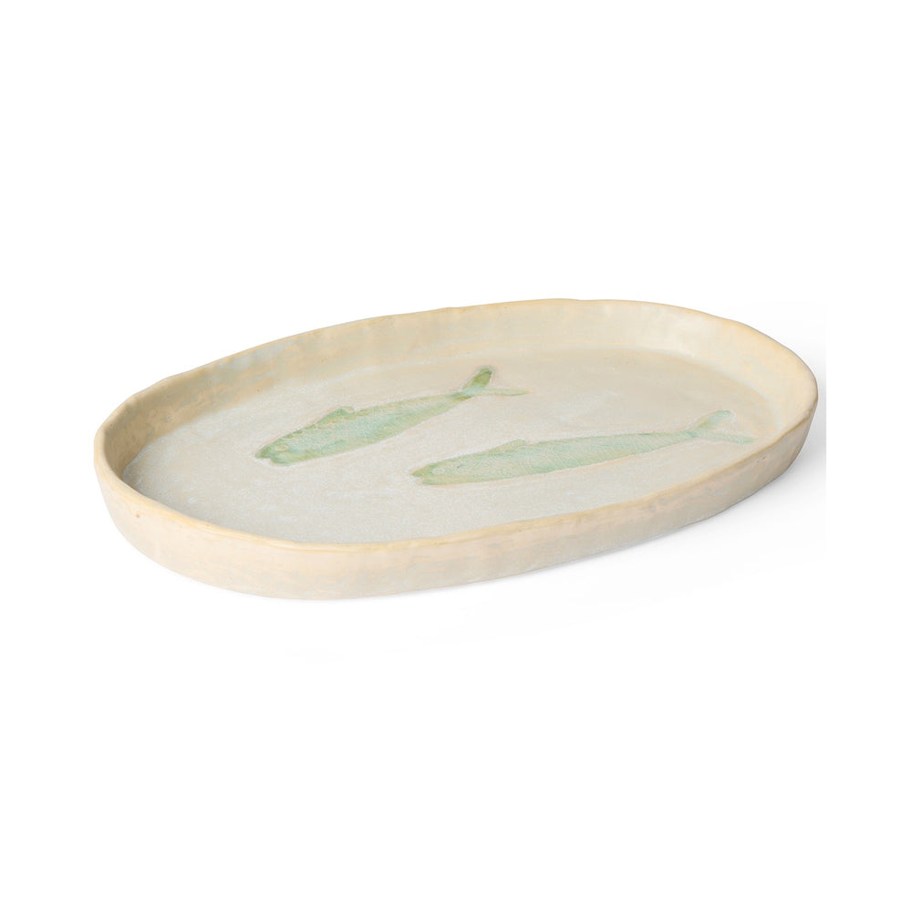 Natural organic-shaped plate with hand-painted green textured sardines and a glazed finish