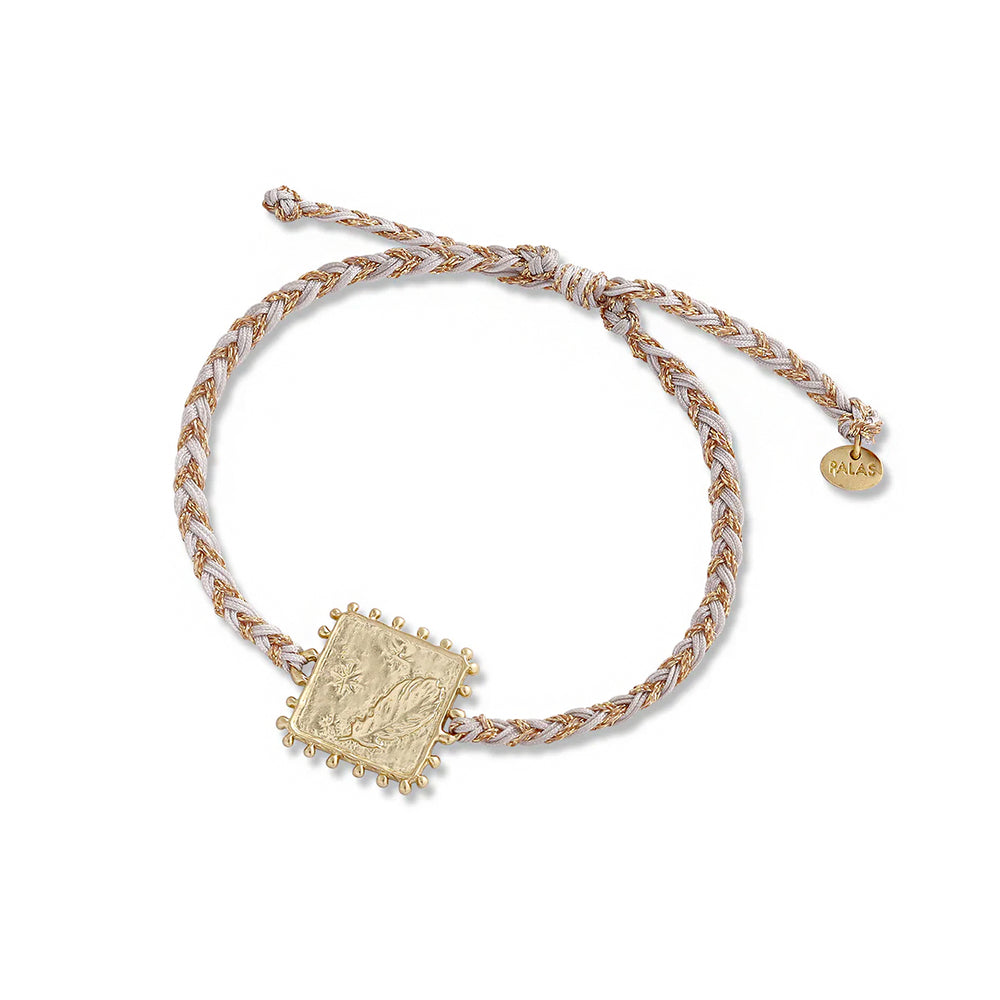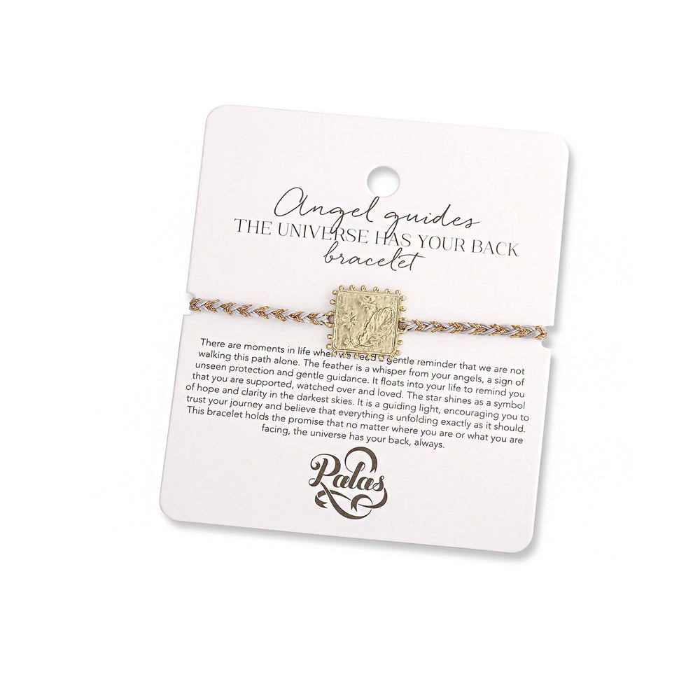 An adjustable cotton and gold bracelet with handcrafted yellow brass charm featuring a feather design and 'the universe has your back' on the reverse.