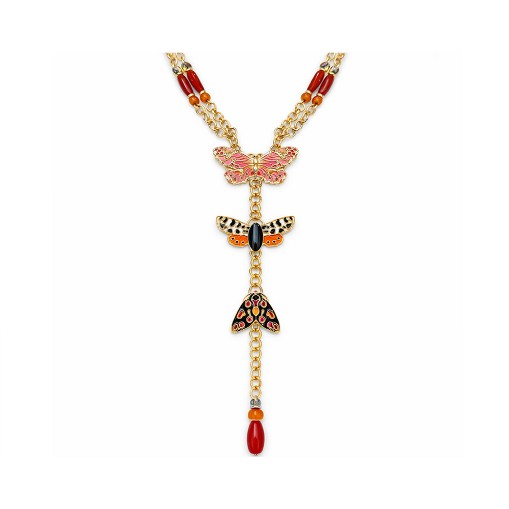 The necklace features a tiered drop of three uniquely detailed butterflies, accented with warm-toned semi-precious stones and beads that add a rhythmic, artisanal touch. Highlighting bold enamel-style work and organic textures.
