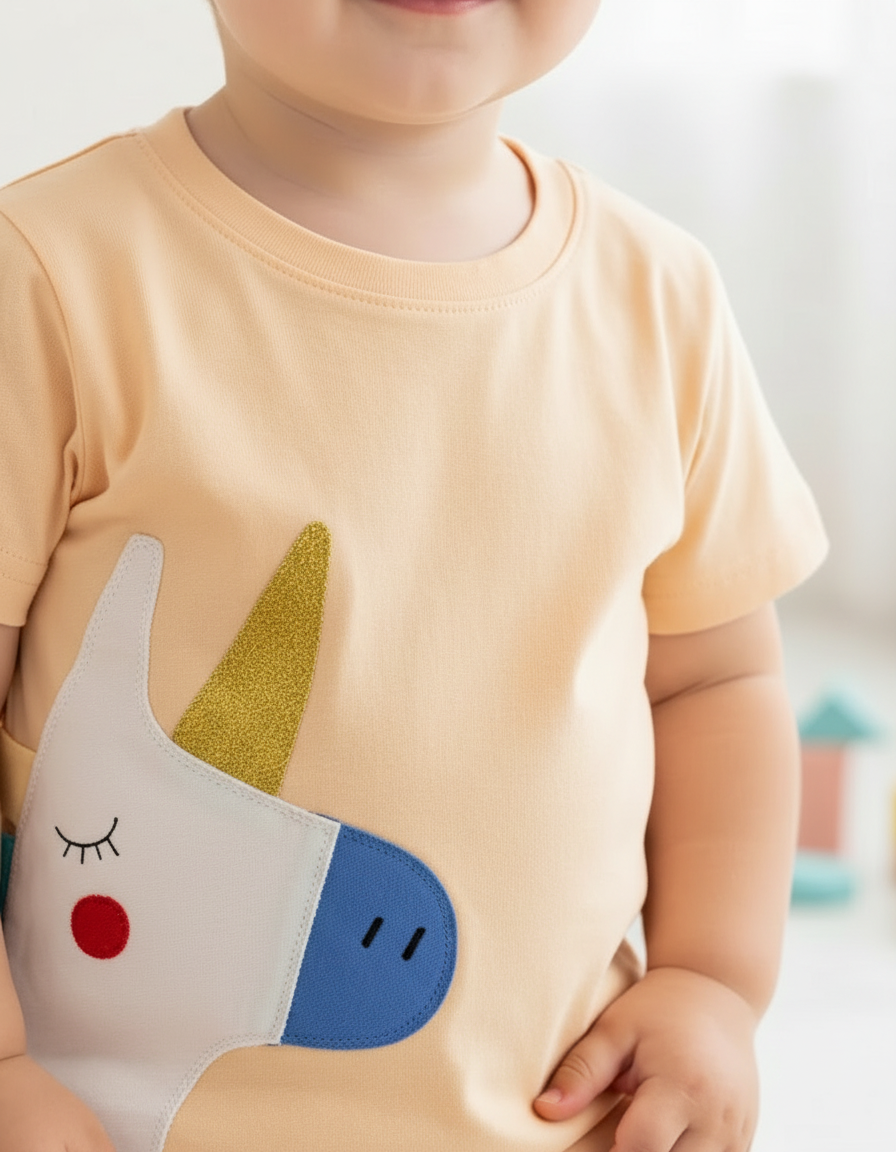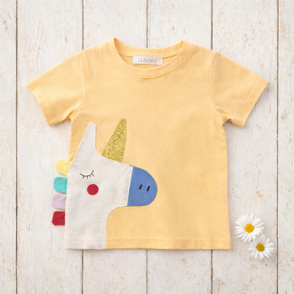 Popping out of an orange background, this unicorn design is just too cute making it the ideal addition for any fantasy-loving kid. A fun detail of the unicorn's colourful mane popping out of the side of the tee is such a special addition that will soon make this top a firm favourite.