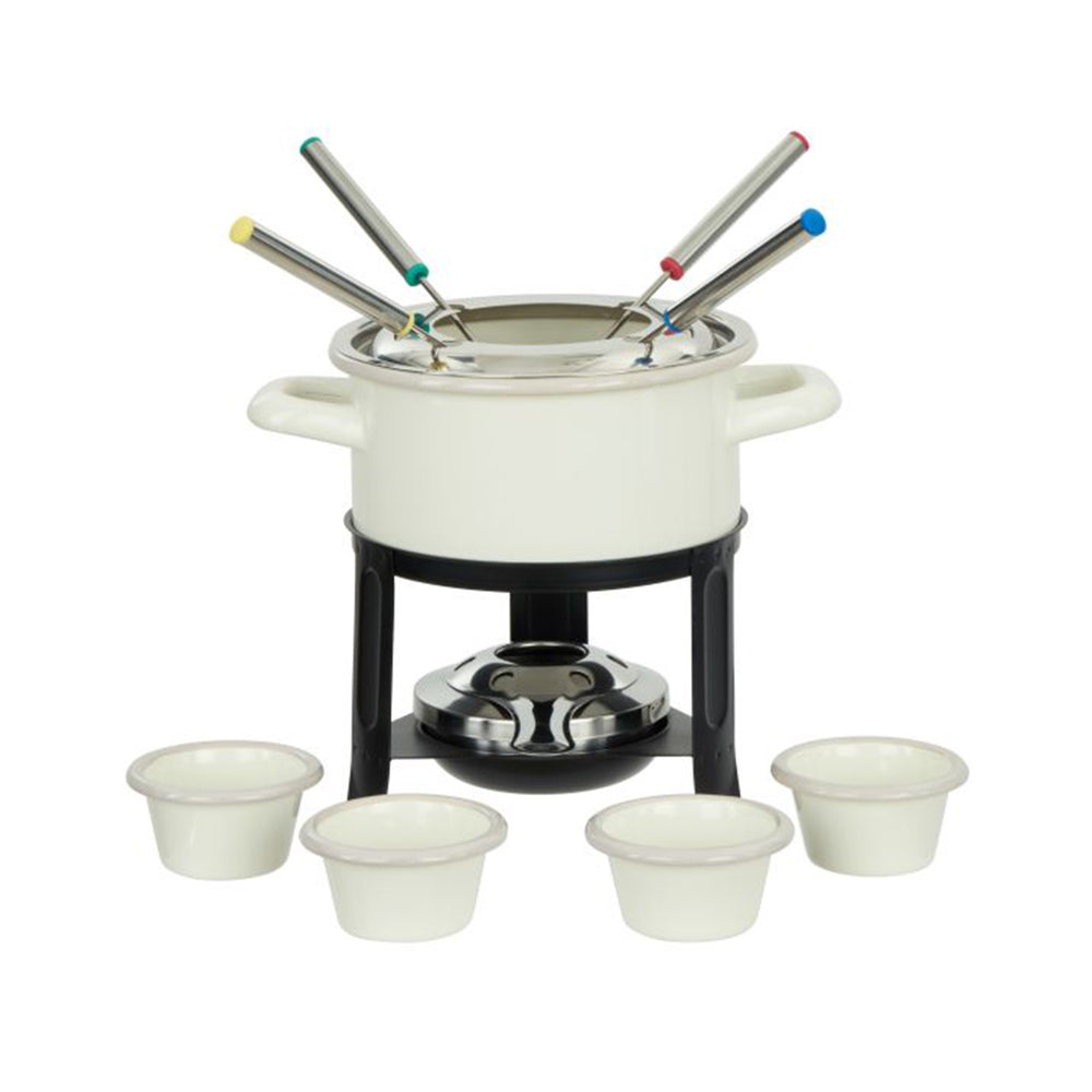 | Extra Features | 3 layers of European porcelain enamel fused onto heavy-duty carbon steel for enhanced durability and a sleek finish. Non-porous & resistant to acidic food Oven safe up to 230°C Free of PTFE & PFOA Enamel pieces are dishwasher and freezer safe Suitable for gas, electric and induction cooking 12-piece set includes: 4 x Stainless steel fondue forks 4 x Mini serving bowls 1 x Splatter cover 1 x Fondue burner (fuel not included) 1 x Fondue stand 1 x Fondue Pot |