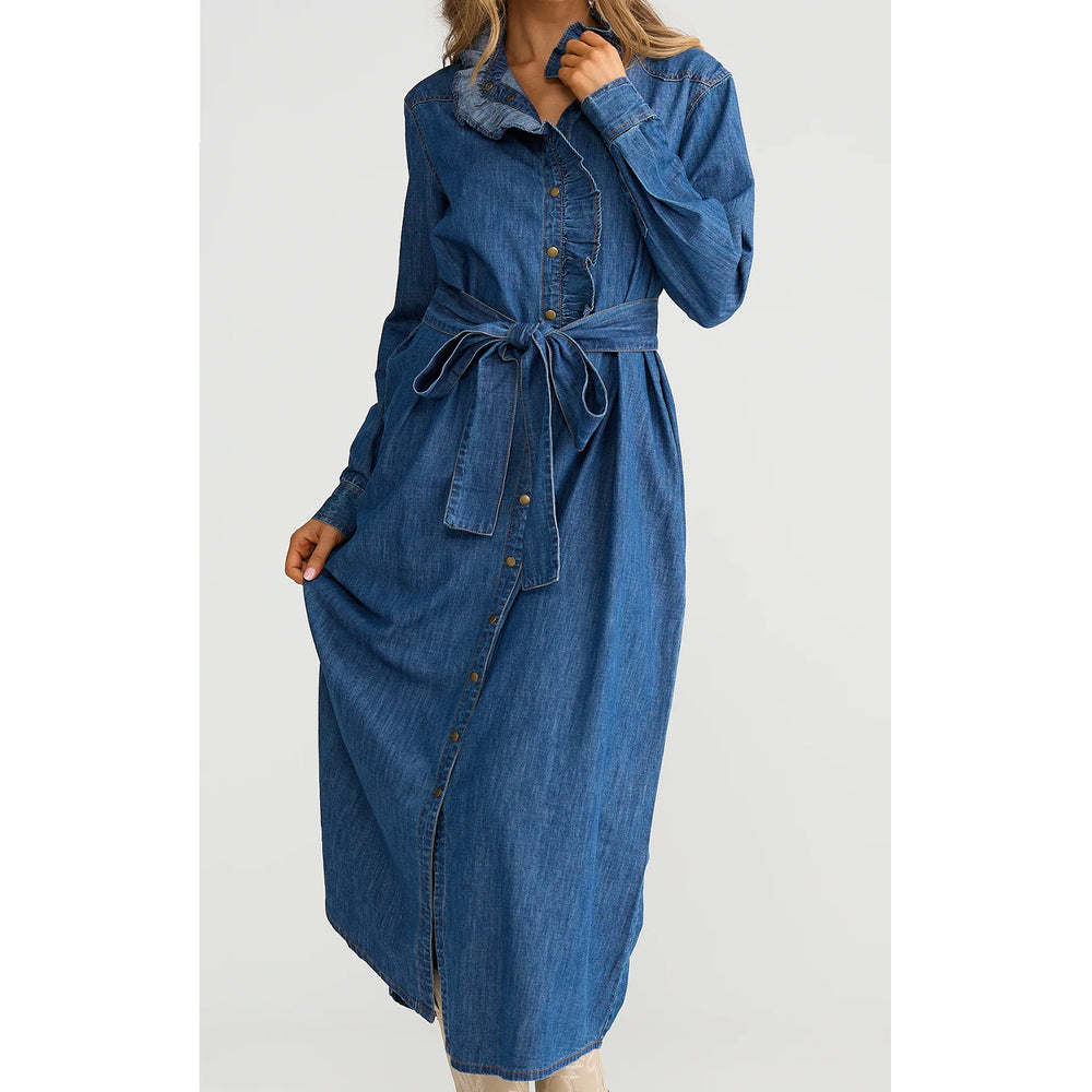 Crafted from rich, deep indigo denim, this ankle-length silhouette features a modern mandarin collar with press stud button detailing and an asymmetrical ruffle along the front placket for a subtle feminine edge. A matching waist tie cinches the waist to create a flattering, defined shape.
