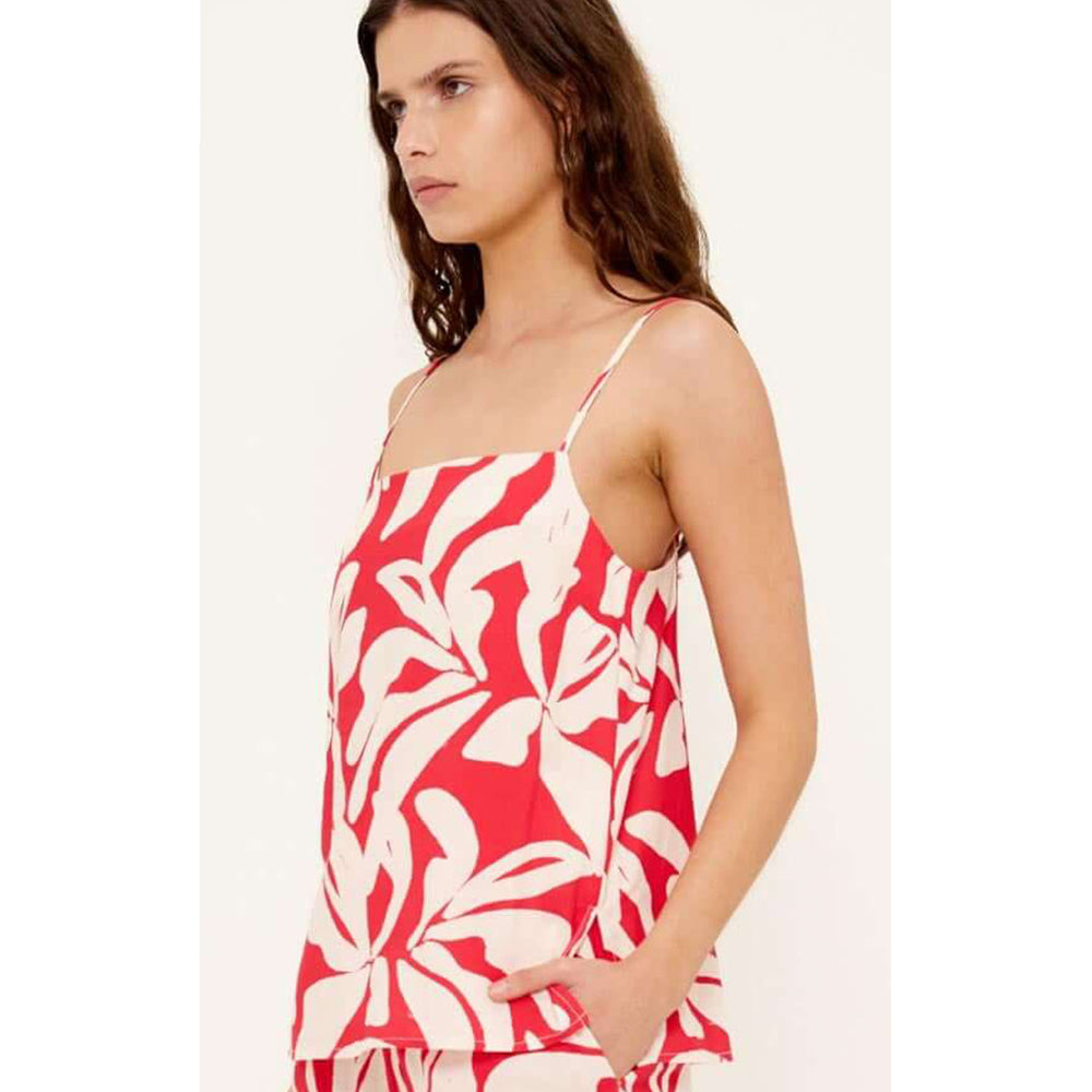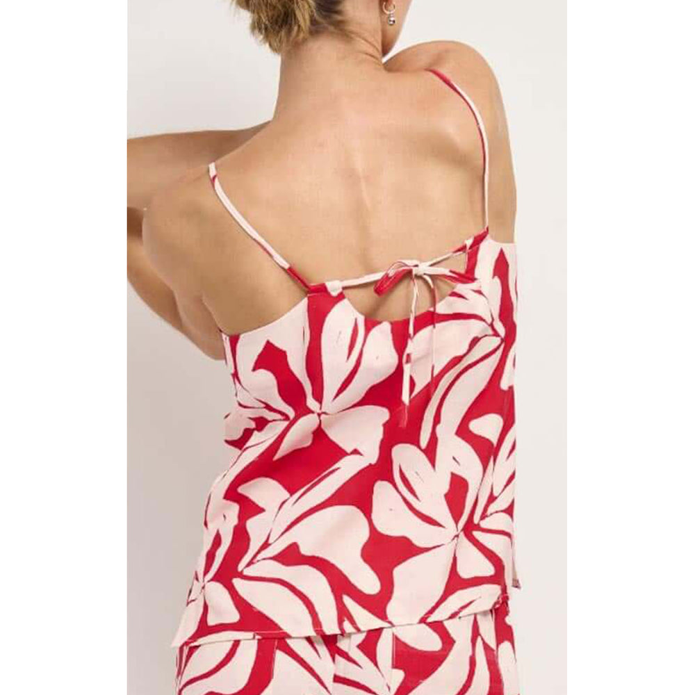 The Serata Cotton Blend Red & White Floral Print Cami Top is a warm-weather essential, designed to pair back effortlessly with the Serata Drawstring Pant or your favourite denim. Crafted from a soft cotton-viscose blend, it features an airy silhouette with adjustable tie-back detailing and delicate spaghetti straps for an easy, feminine finish.