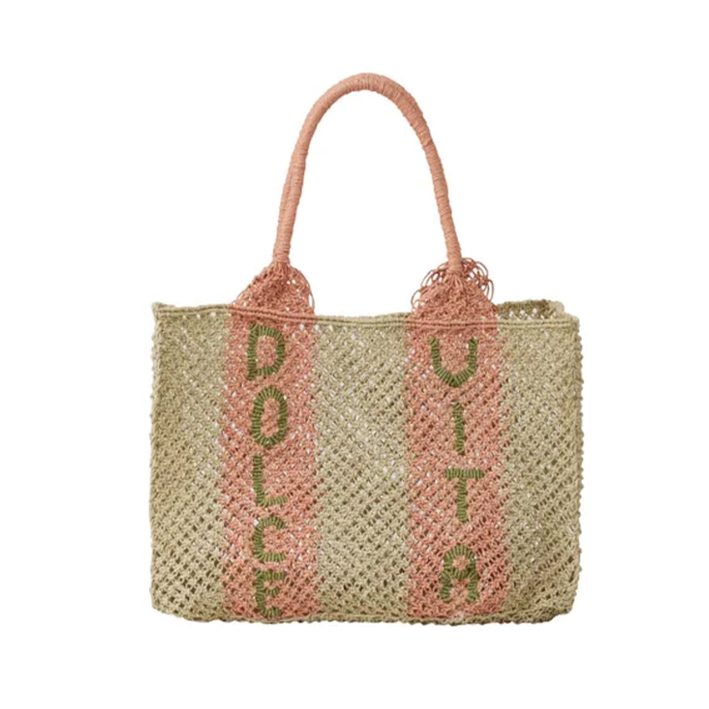 The Dolce Vita Jute Tote Bag is such a fashionable accessory in soft pink and green, you’ll want to take it everywhere you go. In sustainable jute and embroidered with the phrase Dolce Vita (Sweet Life), it redefines arm candy.