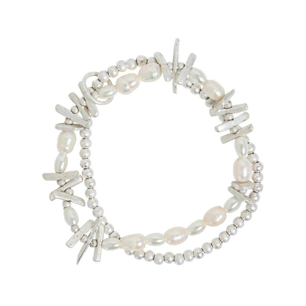 A layered mix of freshwater pearls and silver-toned beads in an organic beach-found style. Each piece in this bracelet set has its own texture, combining into a relaxed yet polished statement.