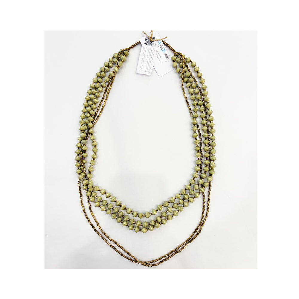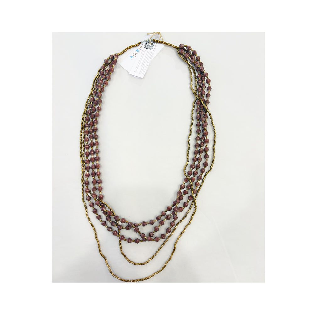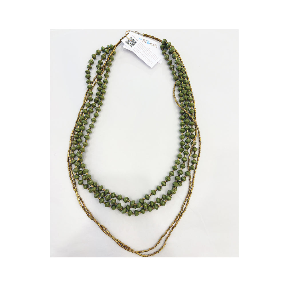 AfriBeads paper bead jewellery is made by a group of artisan woman in Uganda. Each bead is handmade from recycled paper cut into triangles and rolled into beads, then varnished.